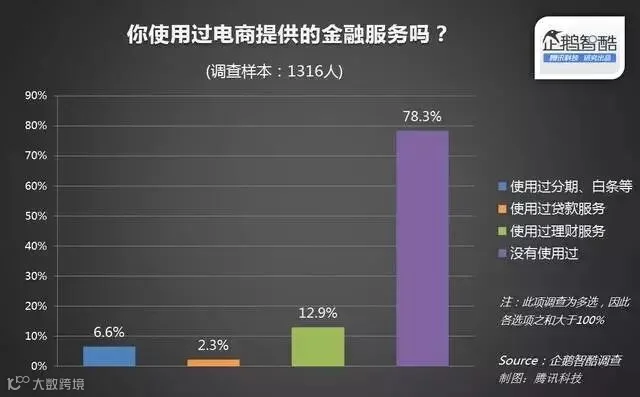 电商提供的金融服务主要有三类:面向消费者的“分期购”、“白条”等消费信贷服务;面向小微商户的小额信贷服务;面向所有人群的理财服务,如余额宝等。这其中,理财服务的使用比例最高,但也仅有12.9%,两类信贷业务的使用比例则更低。近八成用户完全没有使用过任何电商提供的金融服务。