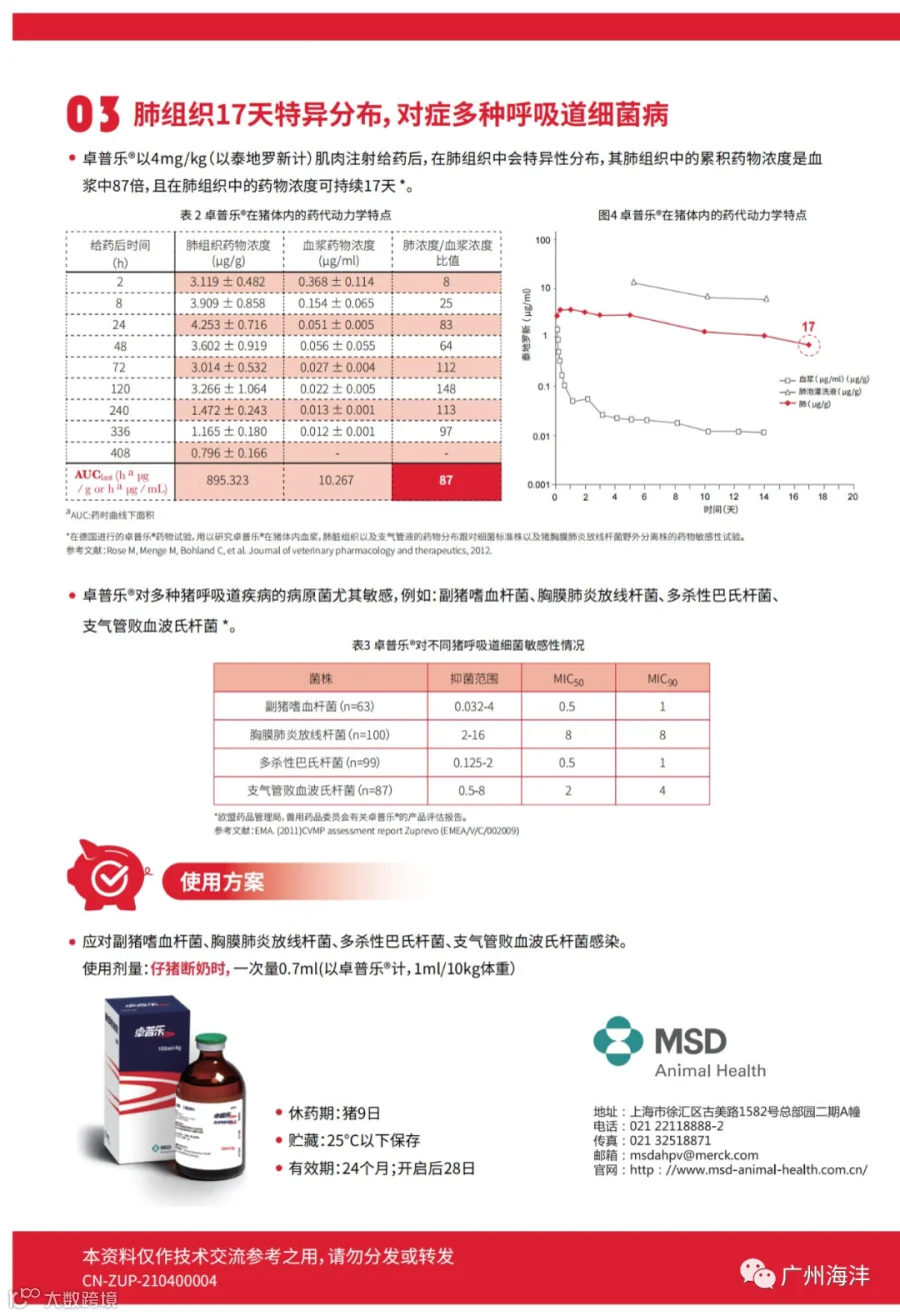 中国上海,2021年1月28日——默沙东 (默沙东是美国新泽西州肯尼沃斯默克公司的公司商号)宣布,其动物保健事业部的原研动物专用抗生素卓普乐®4%【泰地罗新注射液(猪用)】获得中国农业农村部批准,用于治疗和预防对泰地罗新敏感的胸膜肺炎放线杆菌、多杀性巴氏杆菌、支气管败血波氏杆菌和副猪嗜血杆菌等引起的猪细菌感染性呼吸道疾病(SRD, Swine Respiratory Disease) 1。