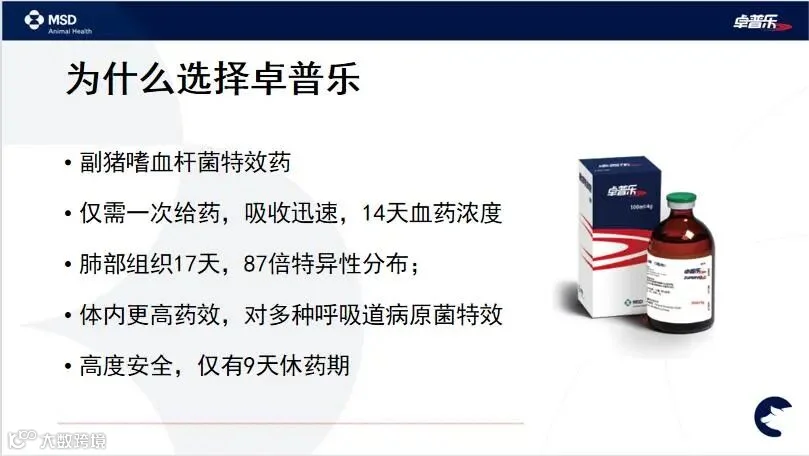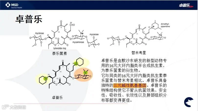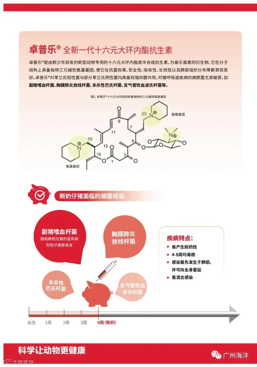 呼吸道疾病一直以来都是牛场和猪场面临的棘手疾病,给养殖场的生产经营造成巨大的经济损失。卓普乐®18%和卓普乐®4%连续在华获批,为牛群和猪群呼吸道疾病的防控提供了综合解决方案,其主成分泰地罗新为具有十六元环的半合成大环内酯类抗生素,可抑制细菌必需蛋白质的合成,从而产生抑菌或杀菌的作用,具有吸收迅速、作用长效持久的特点,一针可有效防治多种病原。