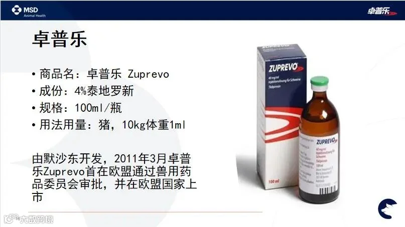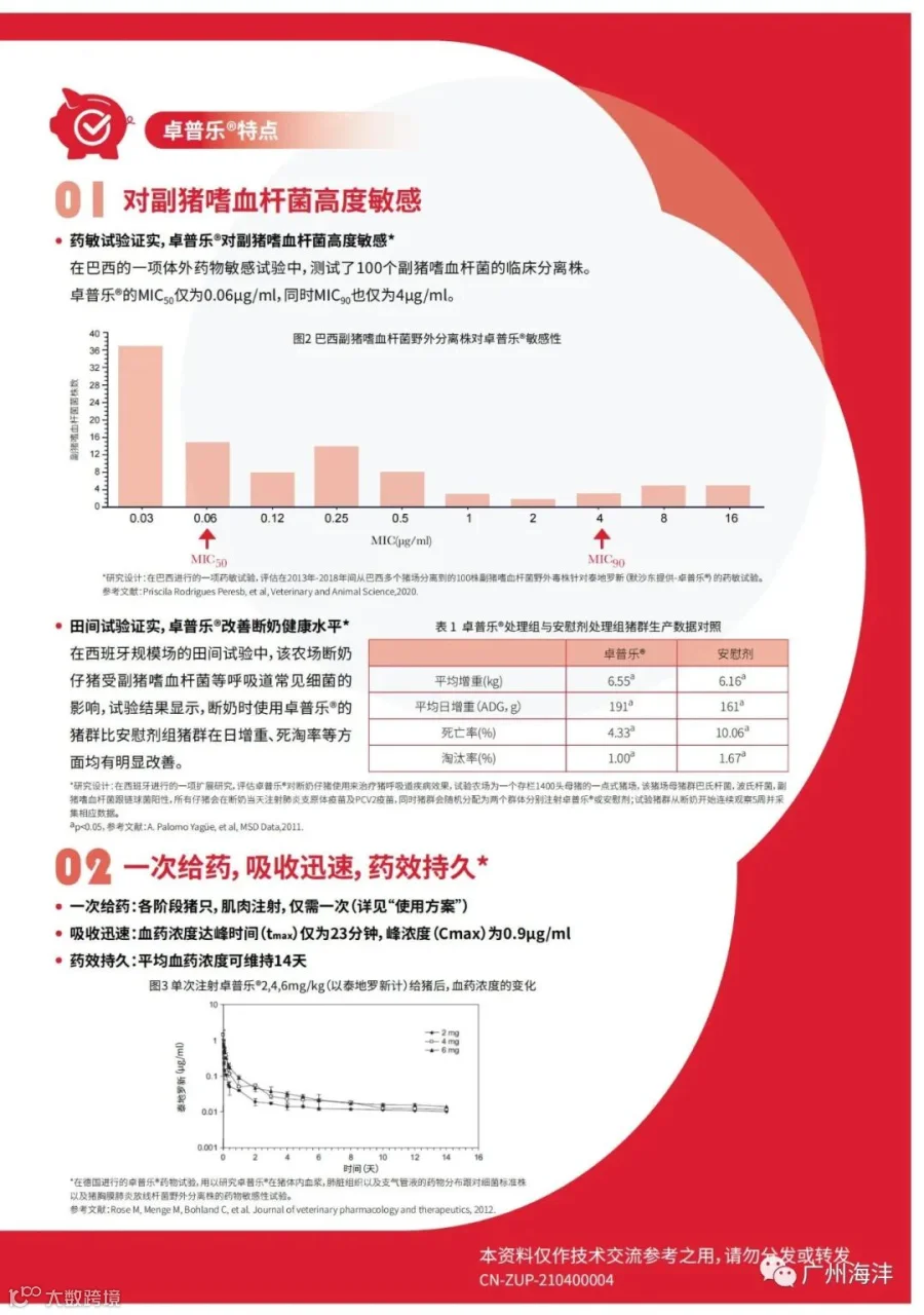 此前,2020年12月4日,卓普乐®18%【泰地罗新注射液(牛用)】获得中国农业农村部上市批准,用于治疗和预防对泰地罗新敏感的溶血性曼氏杆菌、多杀性巴氏杆菌和睡眠嗜组织菌等引起的牛细菌感染性呼吸道疾病(BRD, Bovine Respiratory Disease) 2。
