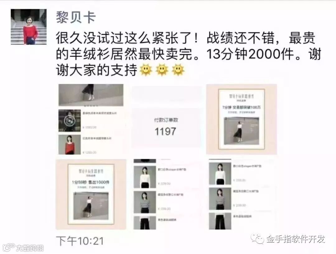 “很久没试过这么紧张了!战绩还不错,最贵的羊绒衫居然最快卖完。13分钟2000件,谢谢大家的支持。”看到一路飙升的数据后,“买买买教主”黎贝卡激动地发了条朋友圈。