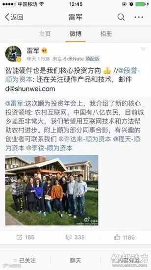 日前,雷军在参加顺为资本年会上表示,其新的核心投资领域为农村互联网,同时称希望该领域创业者可以联系他。随后,雷军在回复“段誉-顺为资本”时称,智能硬件也是其核心投资方向。