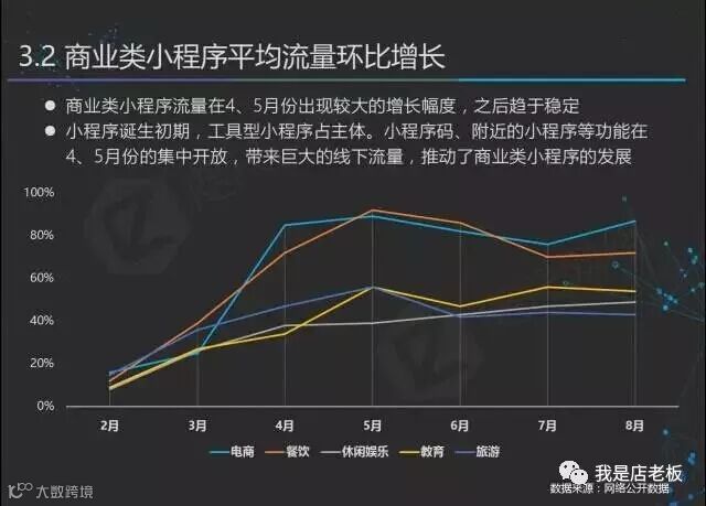 报告显示,电商、餐饮、休闲娱乐、教育、旅游出行等行业领域的小程序一直在访问量有着持续的高速增长,其中电商和餐饮的流量环比增长甚至在5月份分别达到了89%和92%。
