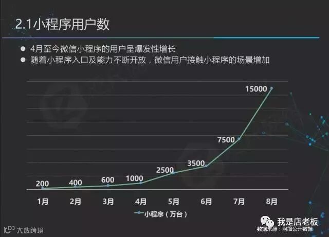 虽然小程序问世的初期阶段并没有出现所谓的“流量红利”,但其用户量在4月份之后就出现了明显攀升,8月份约有15000万台设备使用过小程序,实现了成倍增长。这与小程序的入口及各项能力开放的速度有很大关系。