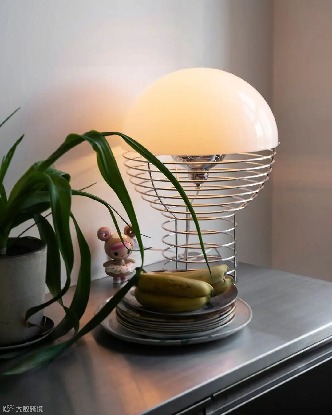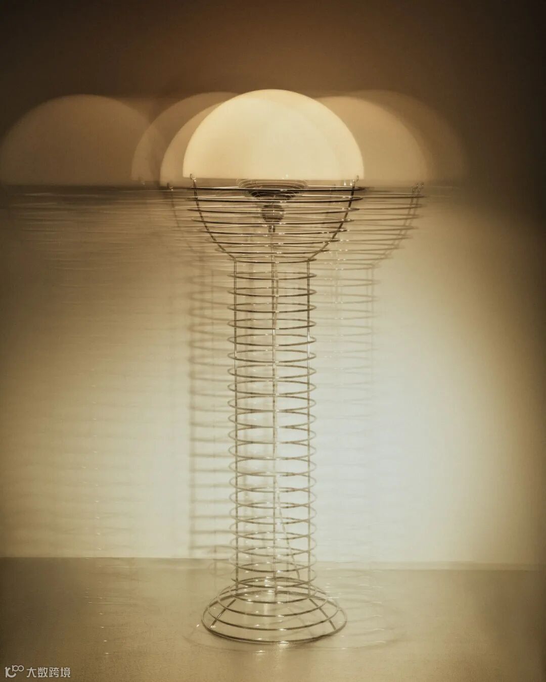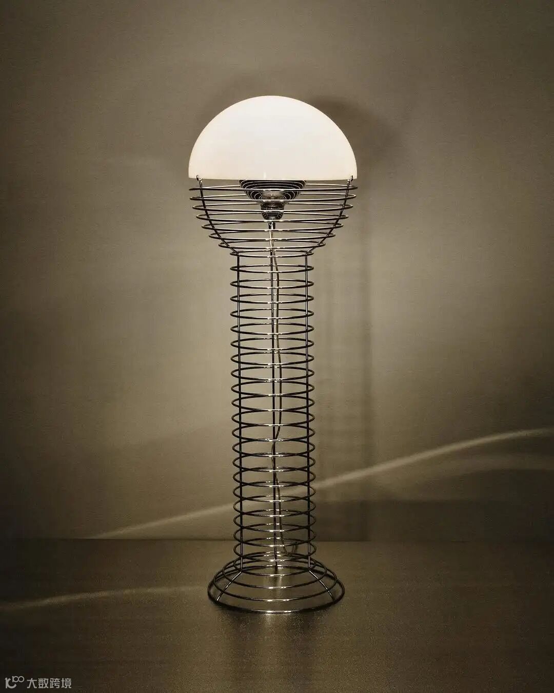 其独特之处在于其镀铬圆柱形钢丝框架,向外扩展为半球形的亚克力灯罩,整体呈现出轻盈、低调的外观。光源巧妙隐藏在内置金属反射器中,光线被导向灯罩内部,从而形成柔和漫射的光晕。