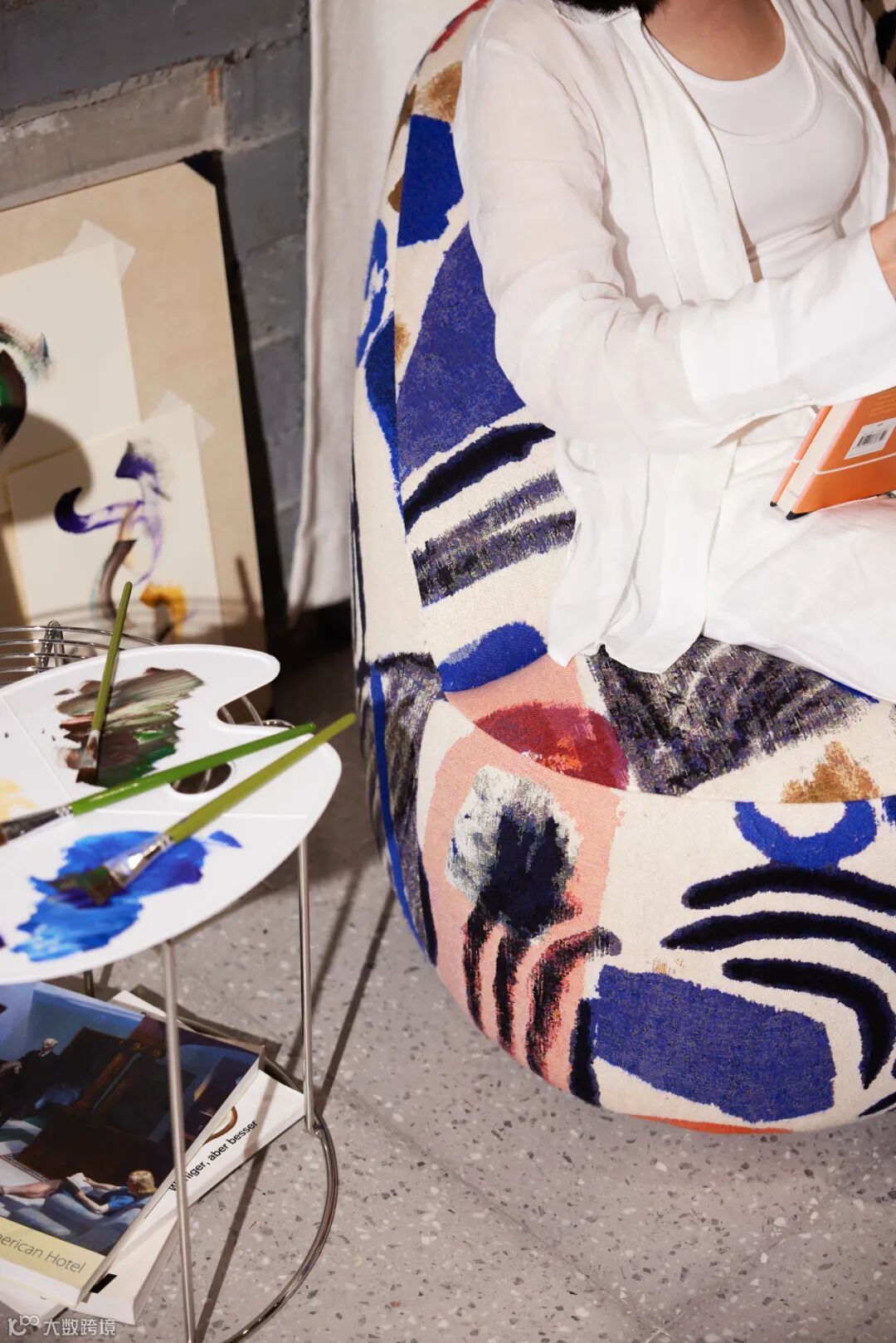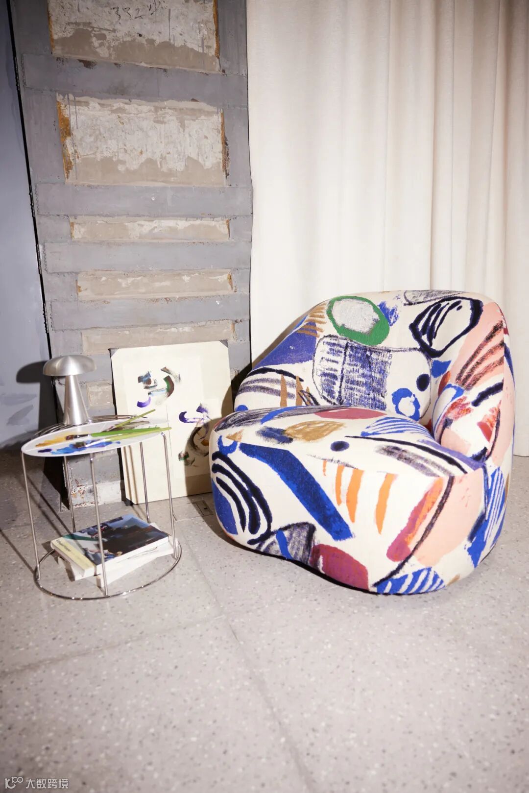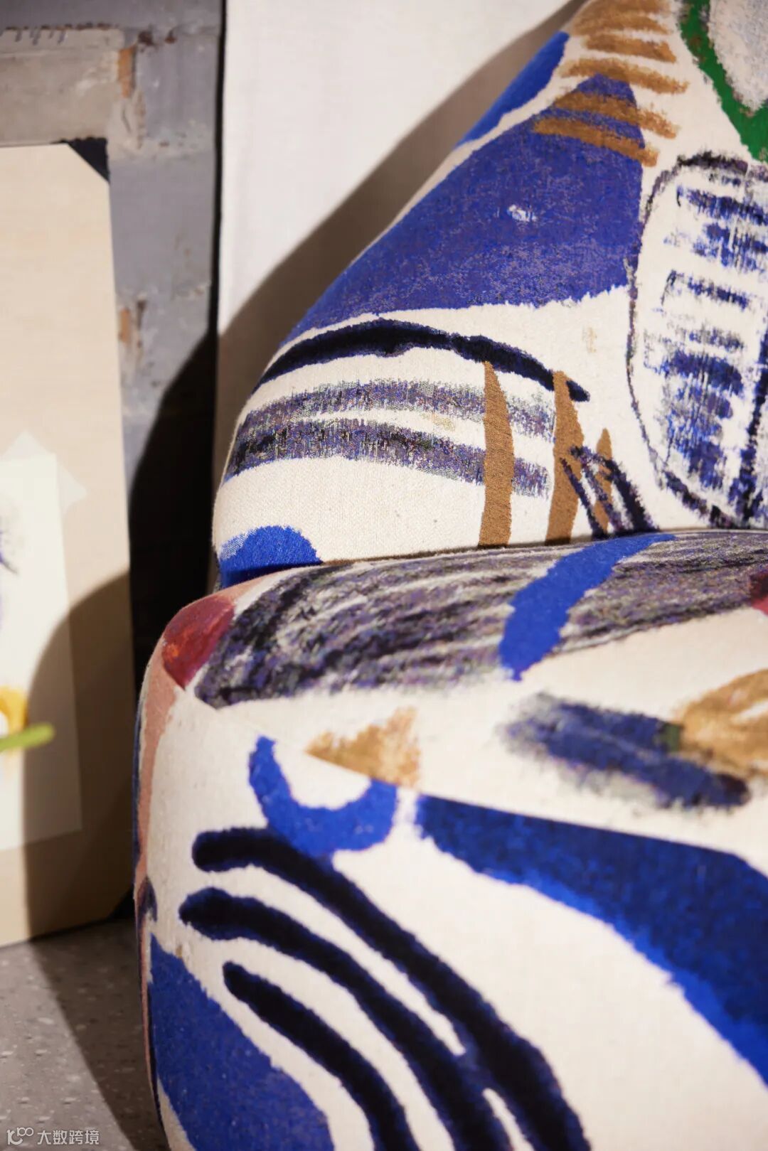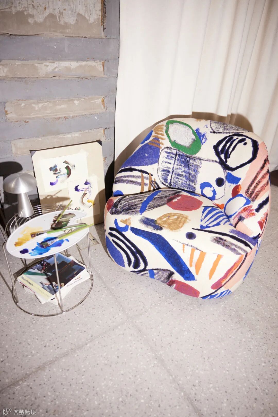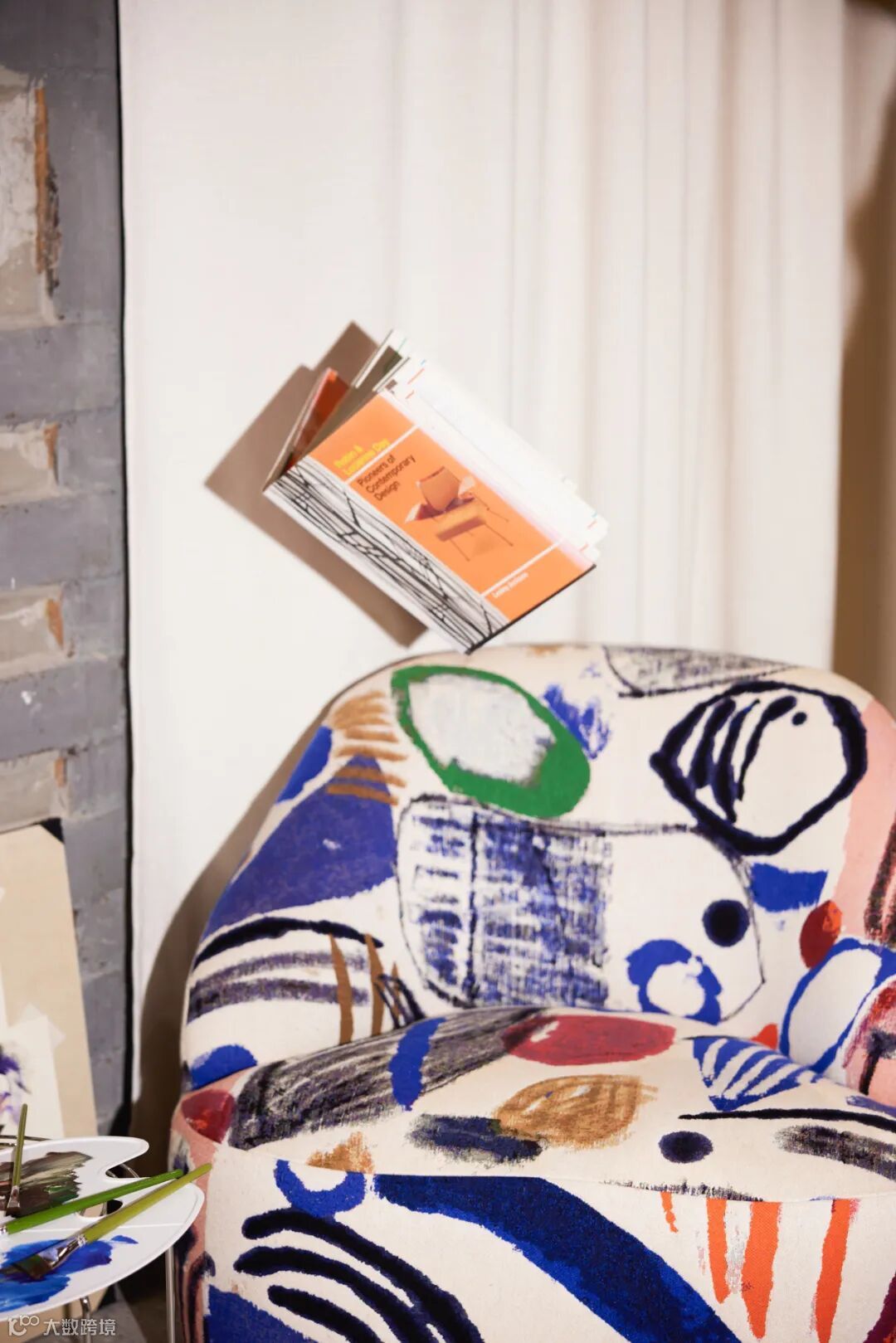 相比而言,定制款沙发布料为空间增色不少。源自法国百年纺织世家 Pierre Frey 与美国抽象艺术家 Heather Chontos 的跨界艺术合作,将画布上的艺术灵魂编织进织物的经纬之间,使得整个阅读角如同可居住的艺术空间。