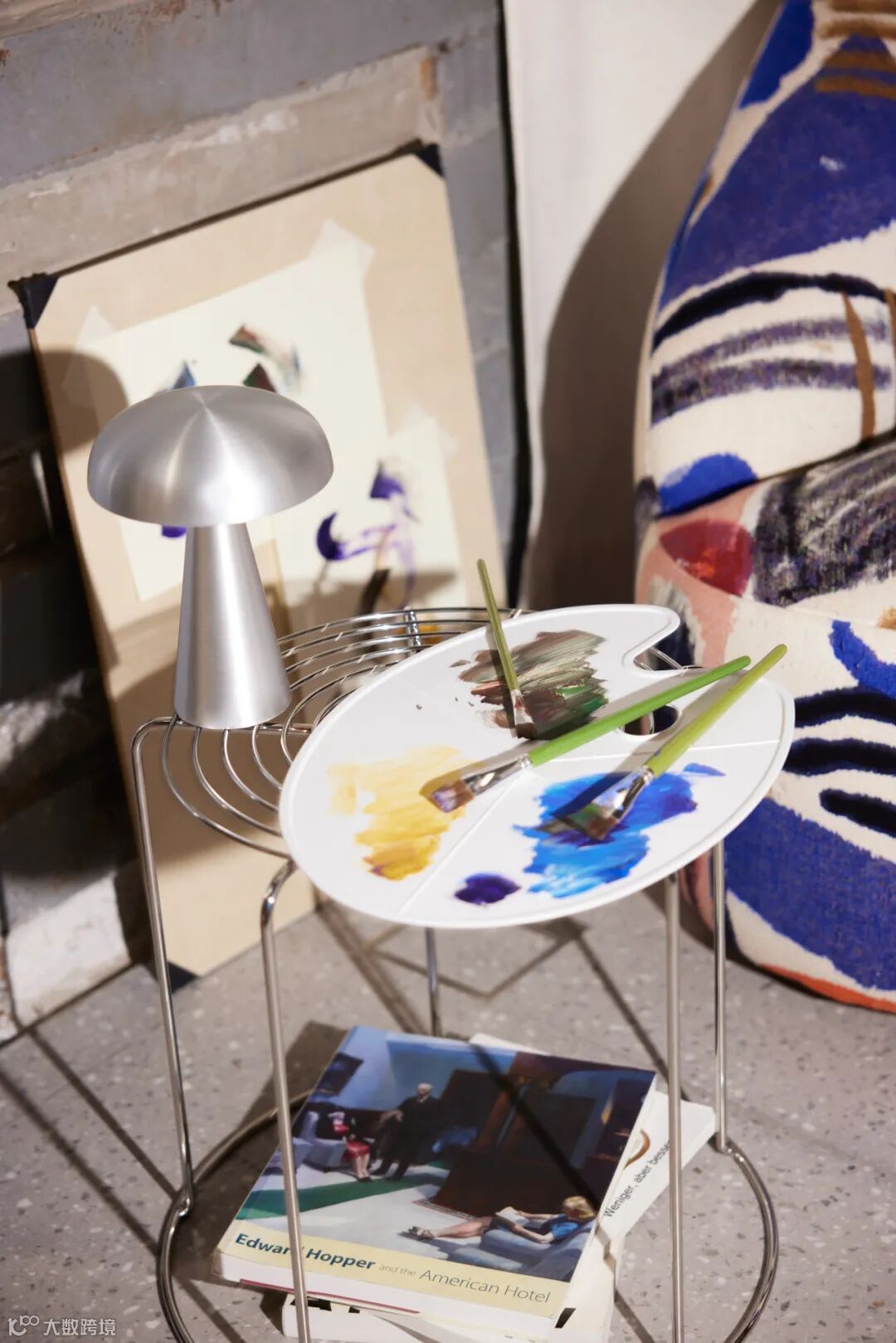 最动人的永远是那些未经设计的细节:画到一半的画笔随意搁在 Wire Stool 上,铝制的 Como 台灯如蘑菇般静静生长。那些规整的书架是无法懂得艺术家的心思。
