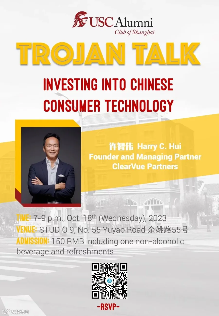 10月13日,南加州大学校友活动将在 STUDIO 9上海举办,ClearVue Partners(cvpcap.com)的创始人和管理合伙人 Harry L. Hui 将分享关于投资中国消费科技的深度见解。