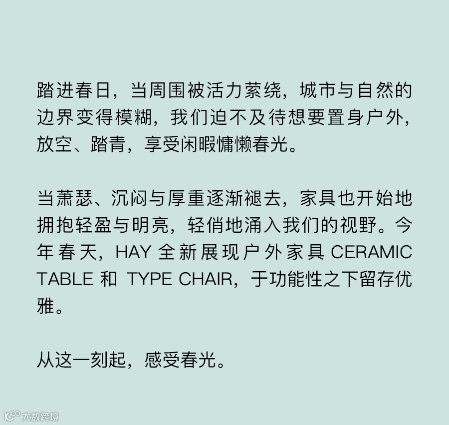 想象一下置身春日,嗅觉被花草散发的自然气味填满,落座于绿意之中的桌边,感知春意拥抱。