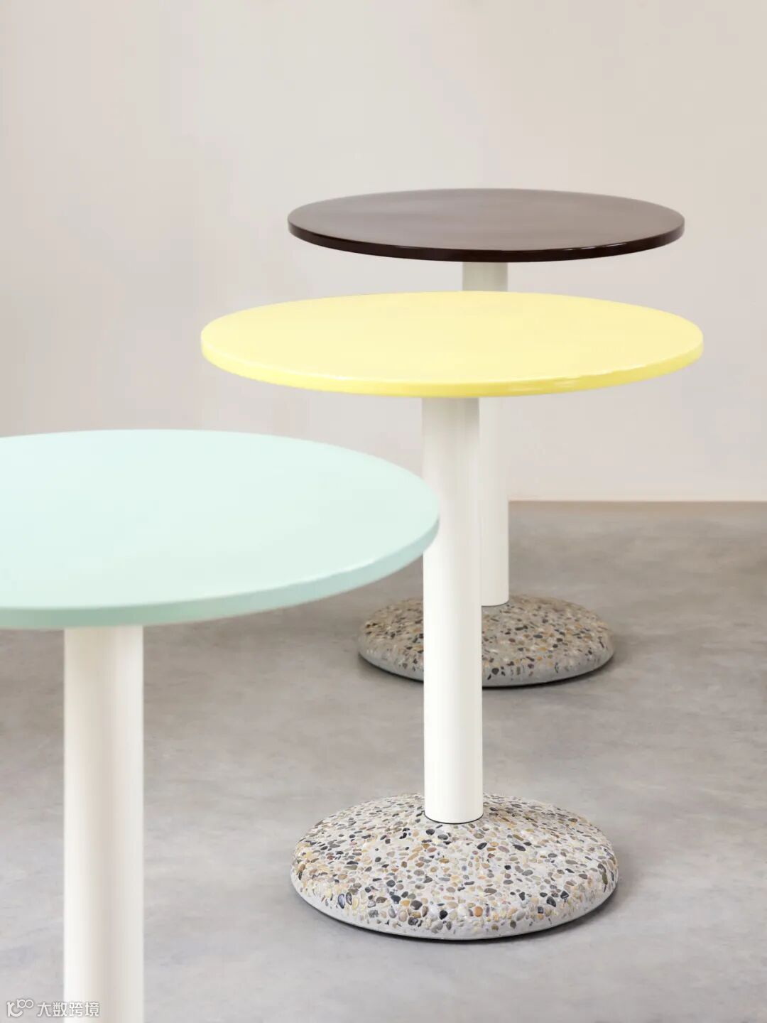 手工烧制的陶瓷桌面与外露的混凝土底座构筑起 Ceramic Table 的基本形态,桌面上的自然纹理如水面上泛起的涟漪,承托起欢愉的氛围。暖白、酒红、薄荷绿与嫩黄四种颜色与自然环境轻松相宜。