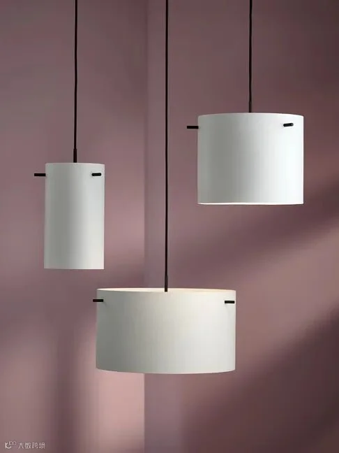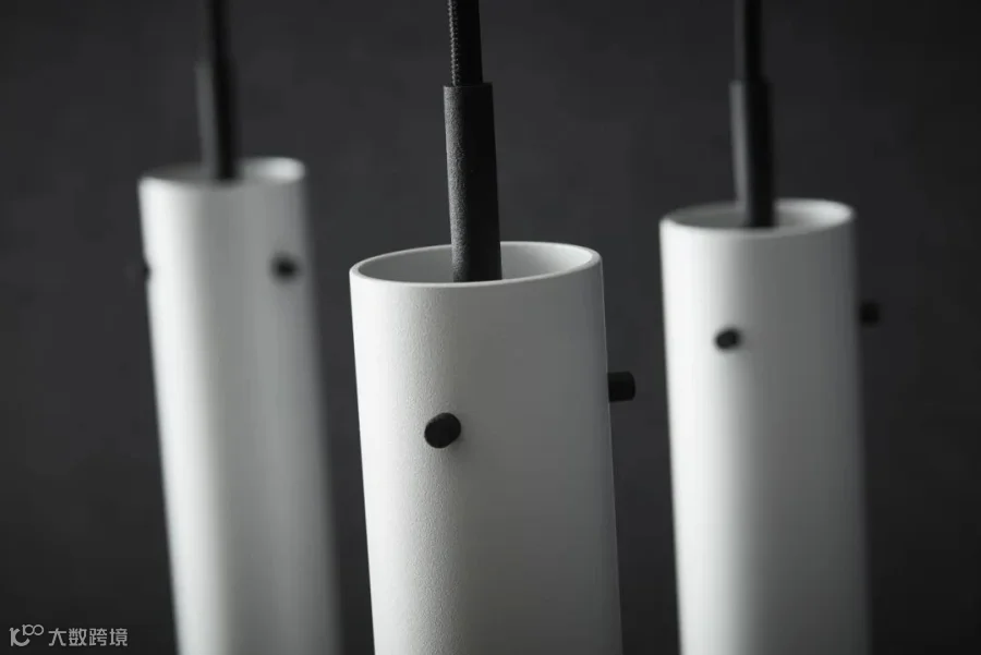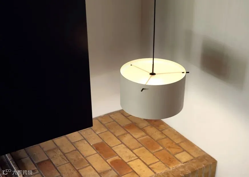 吊灯外观呈圆筒状,一根细线自上而下将其悬起,简单的三条支架作为装饰,视觉感受宏伟,但又轻盈地悬于空间之中。