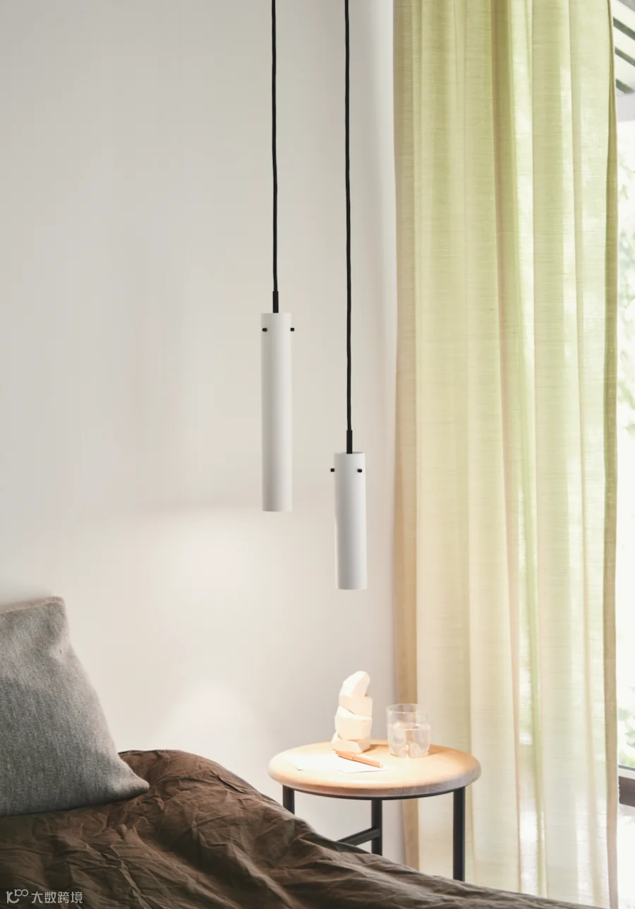 吊灯可排列式悬挂,作为餐厅的流线型装饰布置;亦或是在客厅角落营造隐蔽而温馨的休憩角落;而作为床头吊灯,细长的规格更聚焦光线,让卧室呈现流水般的视觉美感,适配各种风格。
