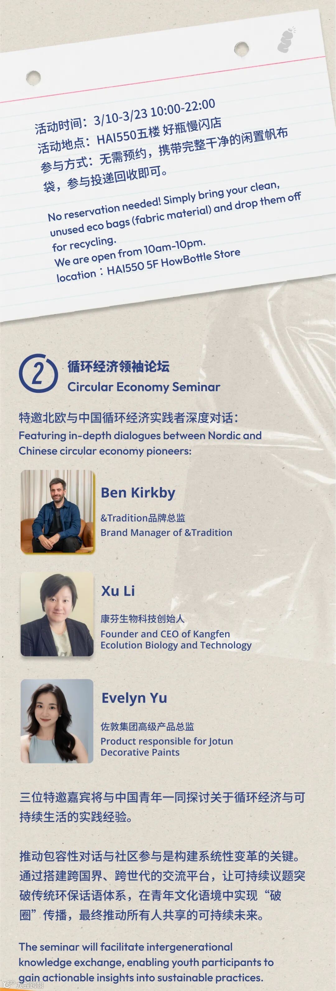 3月23日,STUDIO 9 作为本次【循环经济领袖论坛】的举办地,与大家共同探讨可持续发展的未来。其中,&Tradition品牌经理 Ben Kirkby 也将分享更多相关经验和见解,助力大家更好地融入循环经济领域。诚邀您参与这场意义非凡的活动,一起为创造更可持续、更公平的未来贡献力量。