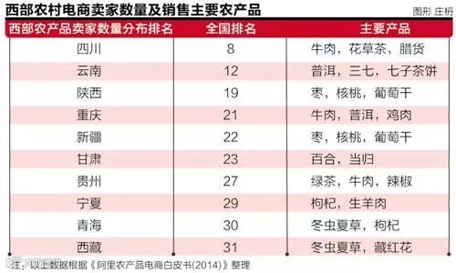 根据阿里研究院的数据,全国范围内农产品销售排名前二十名的城市中,西部只有三个城市上榜,昆明排名北上广杭之后列第5位,成都排名第12位,乌鲁木齐则是第18位。这在一定程度上反映出了西部农村电商发展的滞后。