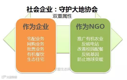 如果只做NGO,很难保证协会的长期运作。要想让NGO健康发展,就需要财务独立,考虑到这些,藤田决定把企业做成社会型企业,即现在的守护大地协会股份有限公司。社会企业具有双重属性,企业的商业属性和NGO的非营利公益属性。作为企业,下设分公司,分别经营宅配、网购、批售、餐厅和生态住宅业务;作为NGO,做推广有机农业,改善校园膳食等公益活动。整个企业是一个团队,但是做两套事情。
