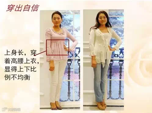 5、看比例:上身长,尽量不穿低腰服装;下身长,尽量不穿高腰服装。