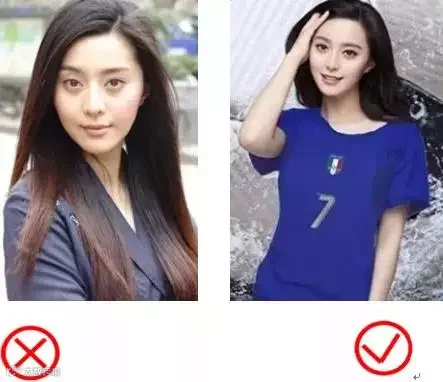 左边图中人物的头发少,穿浅色会漂亮一些;右边图中人物头发多,穿深色会漂亮一些。