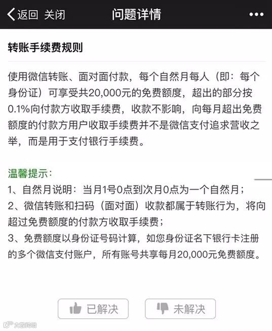 同时,如果一个人身份证名下银行卡注册了多个微信支付账户,则所有的微信账号需要共享这20000元的免费转账额度。
