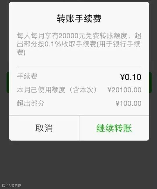 举个例子说,今后使用微信转账50000元,实际支付金额为50030元,20000不收费,30000*0.1%=30元,其中30元显示为手续费。