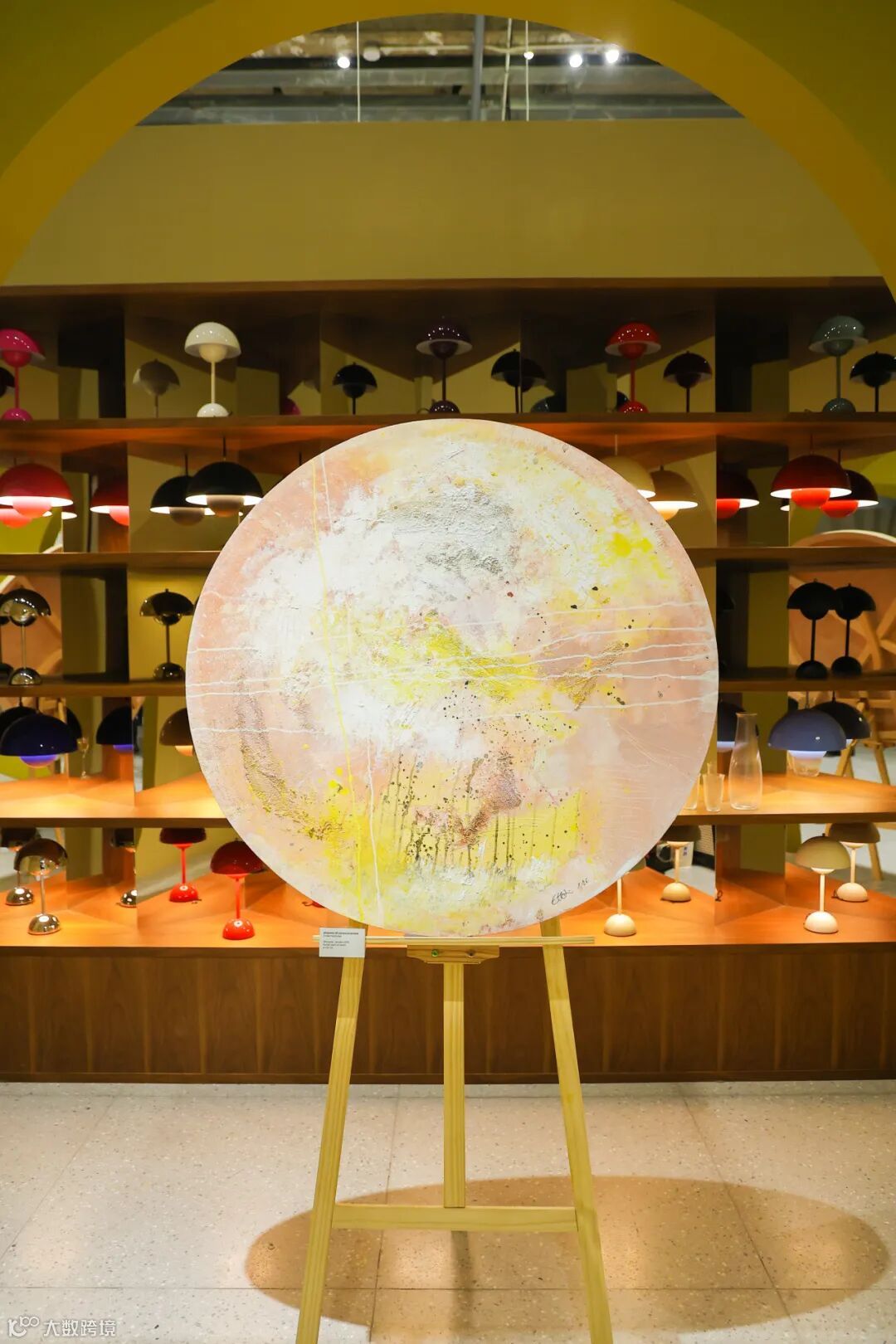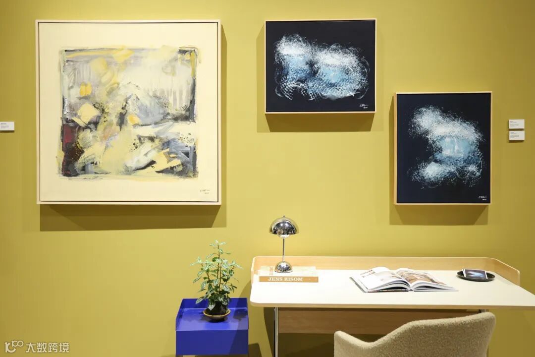 在 STUDIO 9,她的圆形画作被安放于 &Tradition 区域:温暖的陶土色立方体、柔和的拱门与圆形窗洞,构成一个近乎“屋中之屋”的私密场域。这里不像展厅,更像一处可以被进入的内在空间——画作仿佛原本就属于这里。