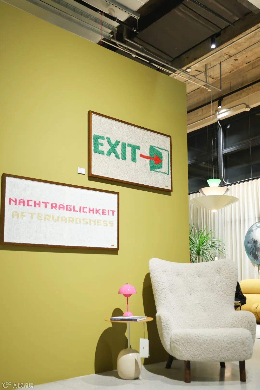 她选择了芥末黄色墙面的空间。色彩的张力,与羊毛作品的柔软形成对照,强化了作品与环境之间的情绪对话。&Tradition 的 Petra 沙发以中性而包裹的姿态,延续了这种安全、温暖的氛围——这里不是被观看的展区,而是一处可以被共享的停留之所。