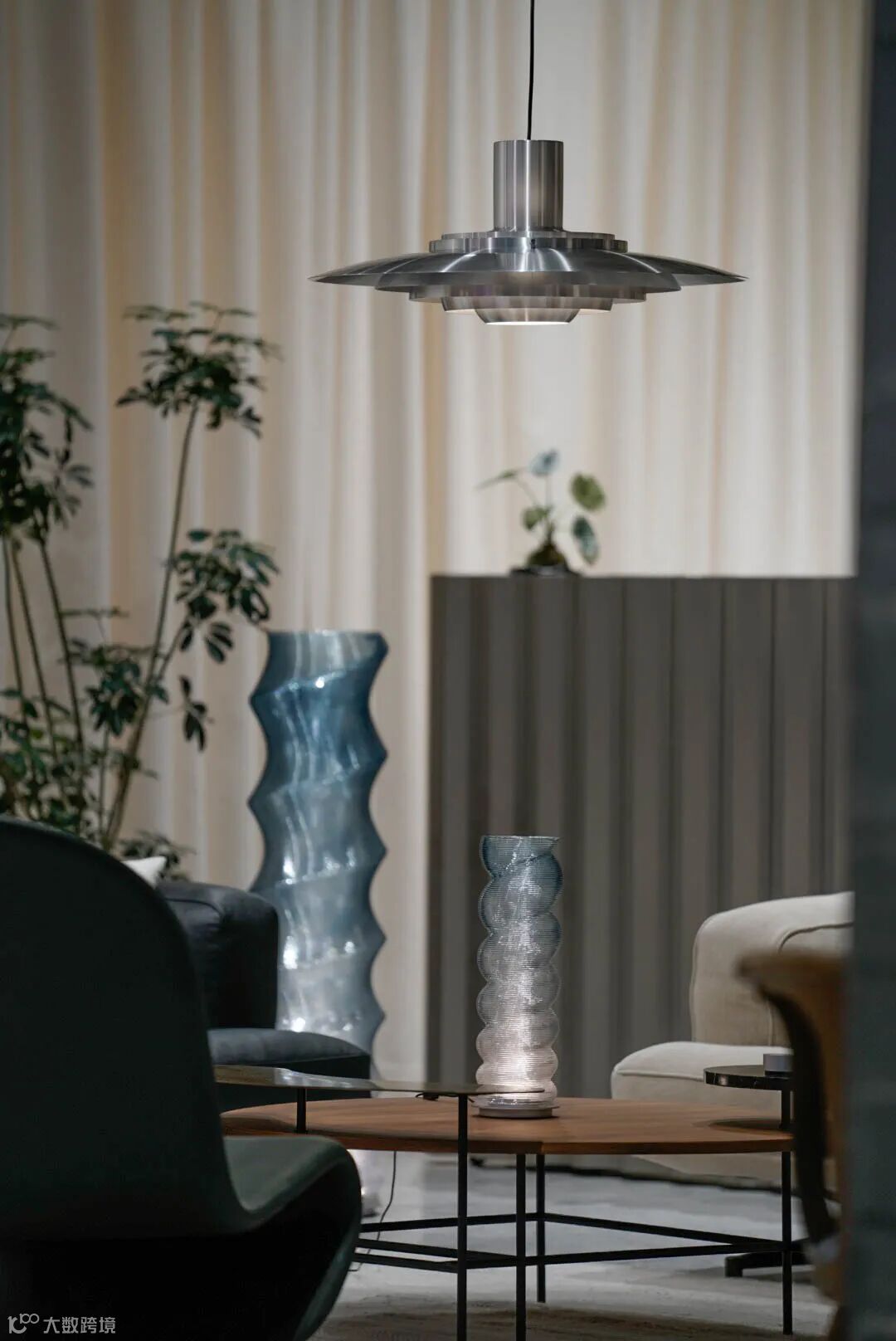 作品被置于 &Tradition 黑色皮质 Inland 沙发所在区域。安静的色调,使蓝色渐变的灯具得以呼吸;白墙、铝板与沙发共同围合出一个舒适而克制的场域。