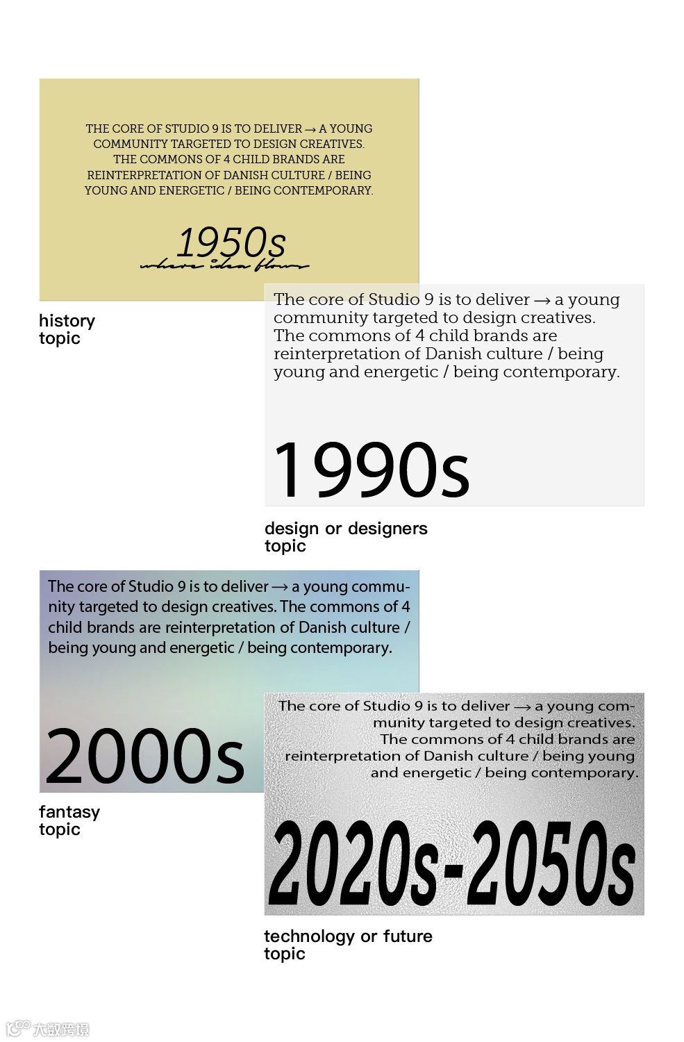 STUDIO 9集合了4个丹麦设计品牌,颜色也丰富多样。因此在字体设定上,我们延续含蓄但充满细节变化的美感基础,为字体应用规范设定了变化组合,既可体现历史的美,在未来感的语境中也不违和。