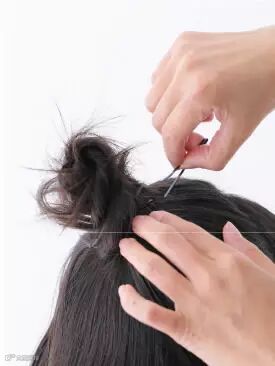 把发束折回橡皮筋的部位,绑成“小鼓包”并用发簪固定。