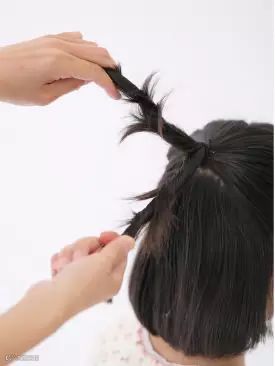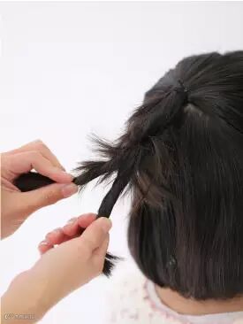 选取耳际上的头发,用橡皮筋绑成一束。