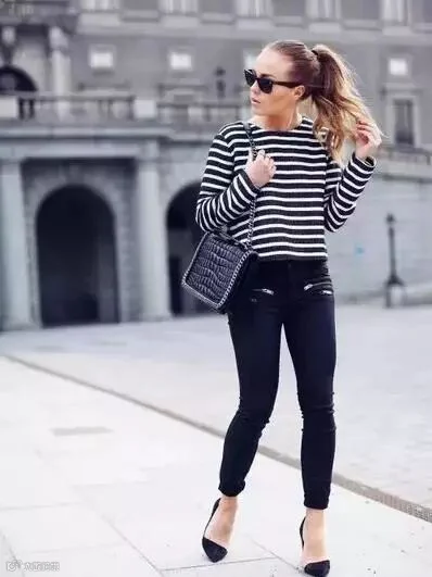 黑色+条纹万年经典、永不过时、百搭耐看!而且黑色是万能百搭色,无论什么颜色的条纹衫都可以搭配!