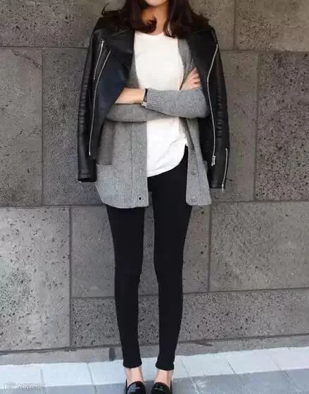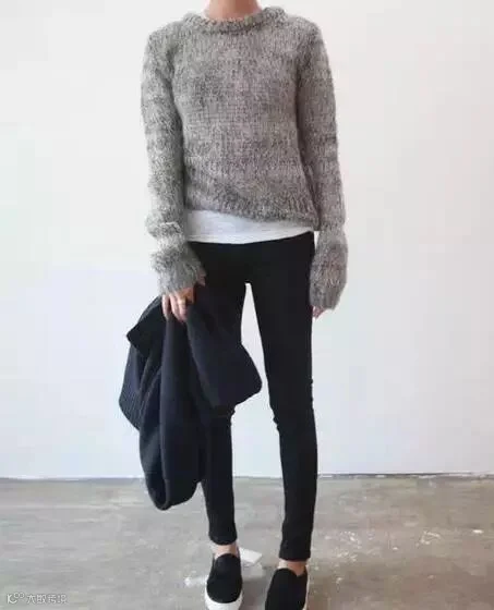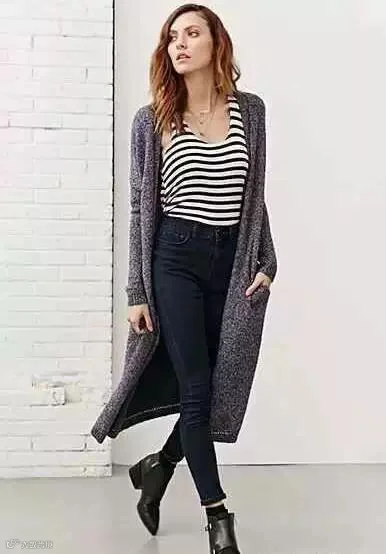 最后说一个现在这个季节最实用的穿搭,紧身的小黑裤搭配针织或雪纺面料中长款针织开衫,显瘦、遮肉、有气场!