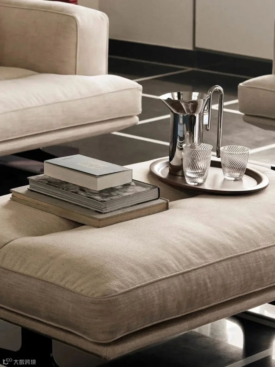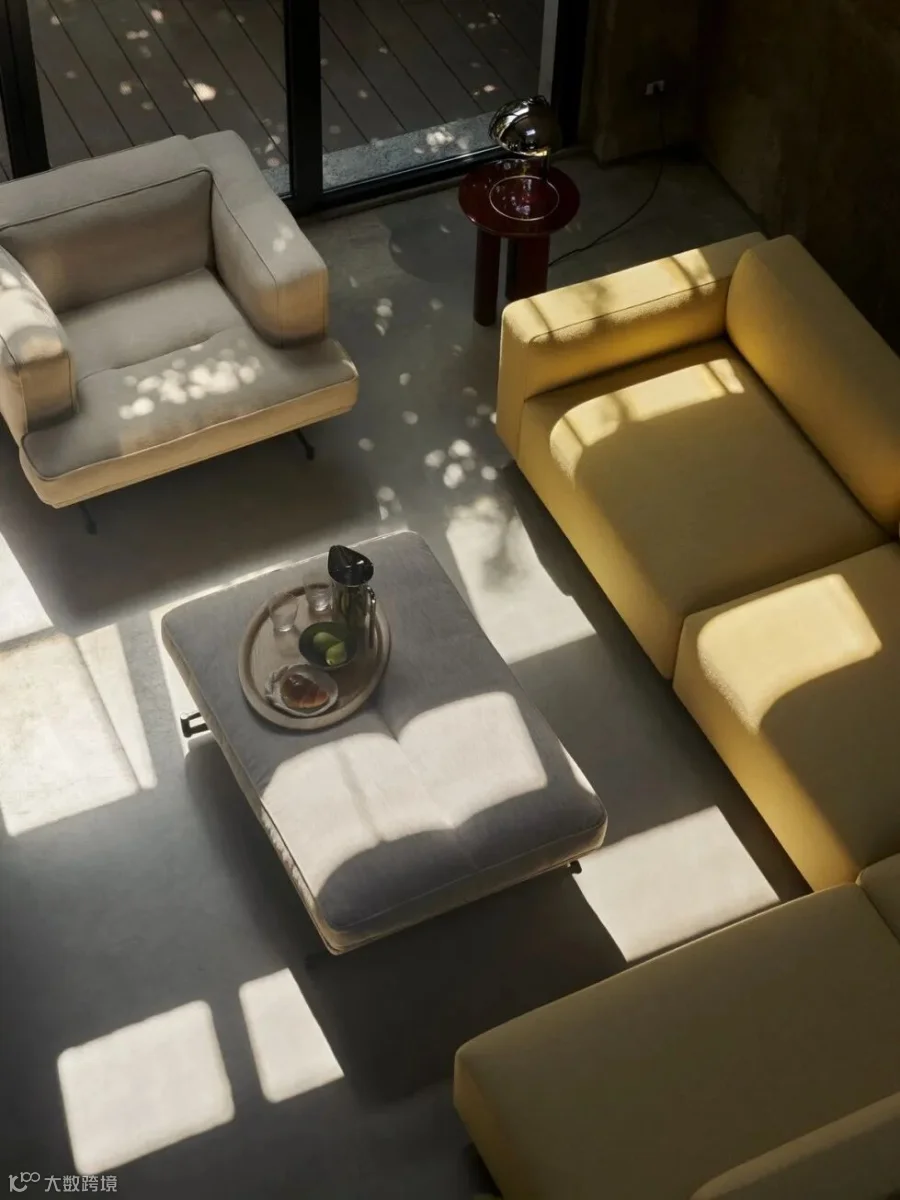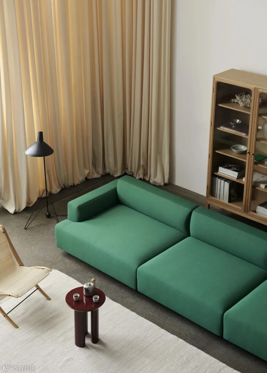 而系列中另一款亮点,Pouf 脚凳的加入则为整体增添了新的层次。脚凳的存在不仅让人能够坐下并抬起腿部,增强了飘逸的视觉效果,还可以将其作为 Inland 沙发的躺椅延伸,或者在需要额外座位时使用。