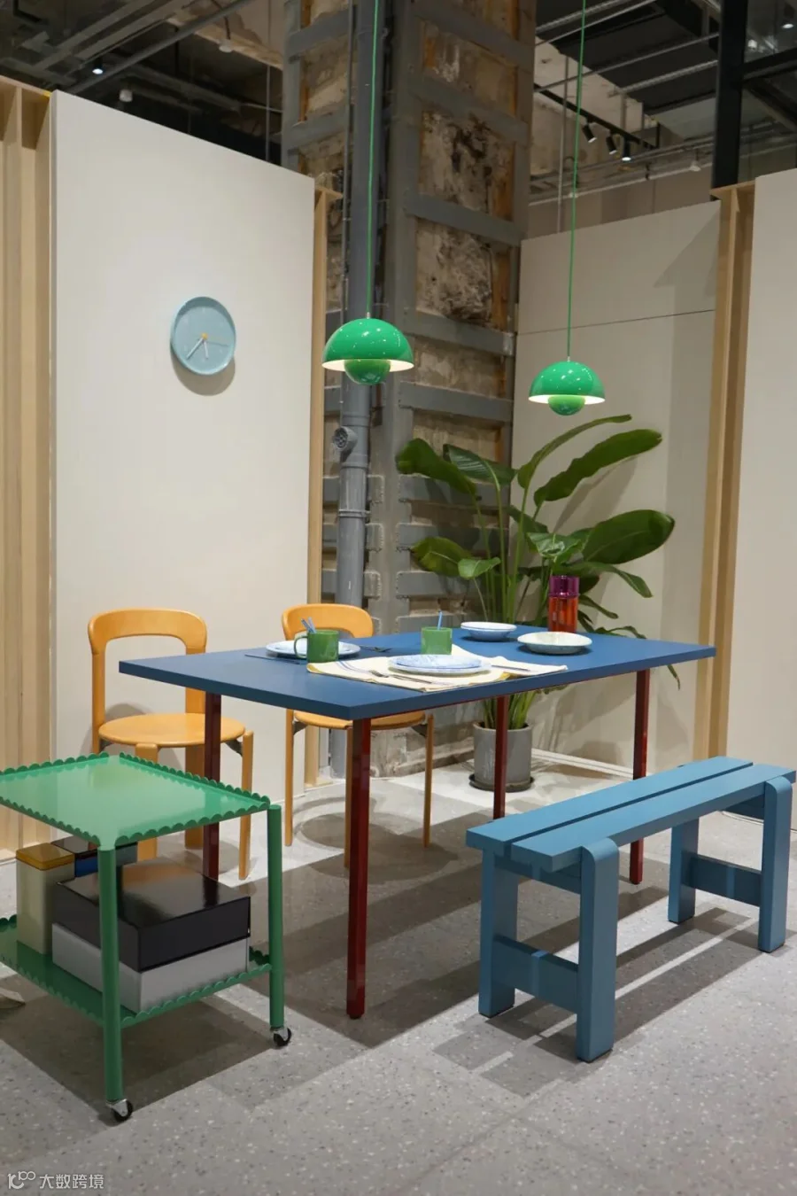 由比利时设计师组合 Muller Van Severen 为 HAY 设计的 Two-Colour 餐桌,以红蓝双色合奏,与 &Tradition 经典的 Flowerpot 系列吊灯与壁灯,相映成趣,碰撞出令人食欲倍增的用餐空间;