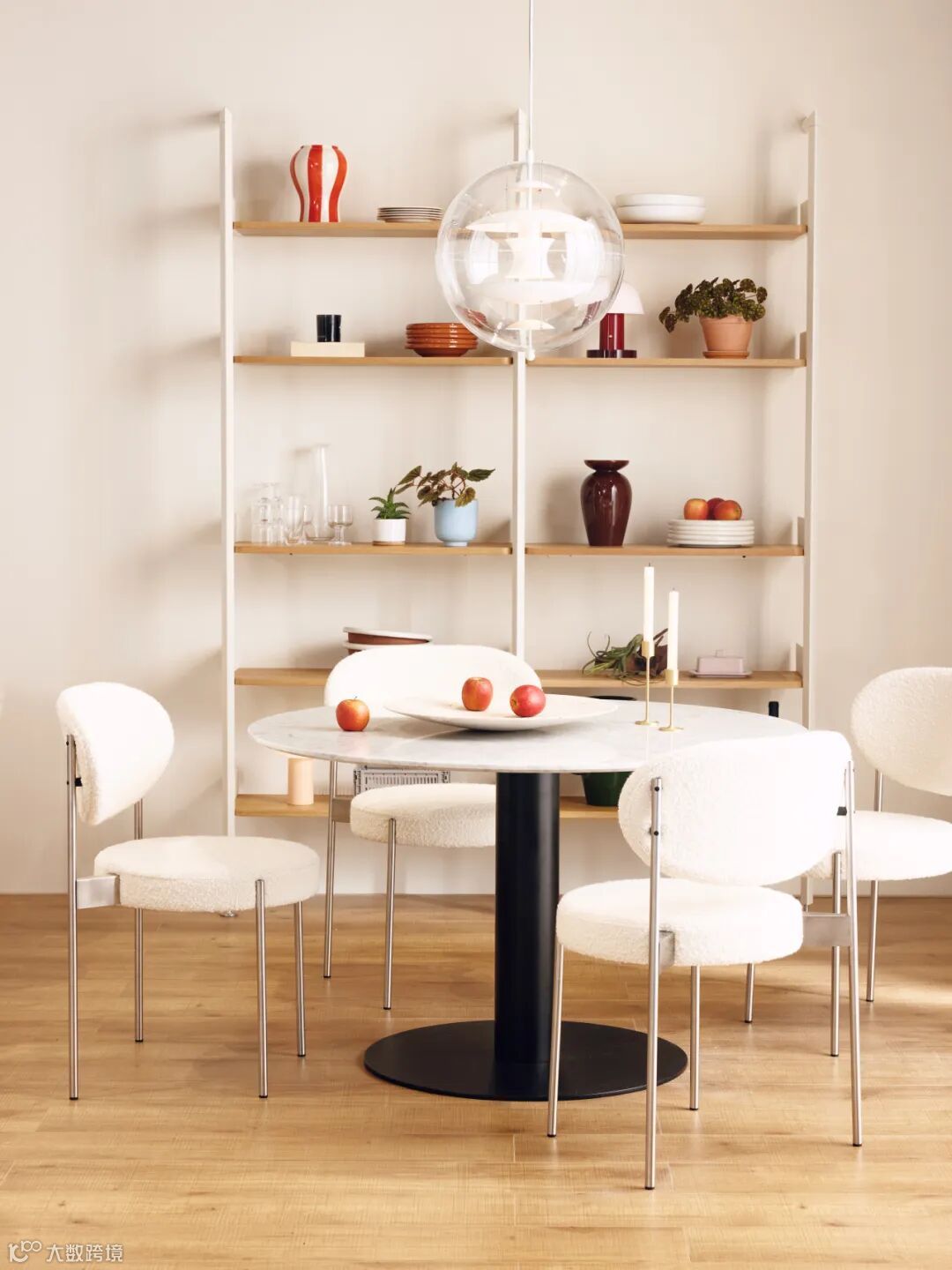 而在客餐区域,VERPAN 的 VP Globe 吊灯则如一轮温柔的月亮,陪伴家人围坐交谈的夜晚。