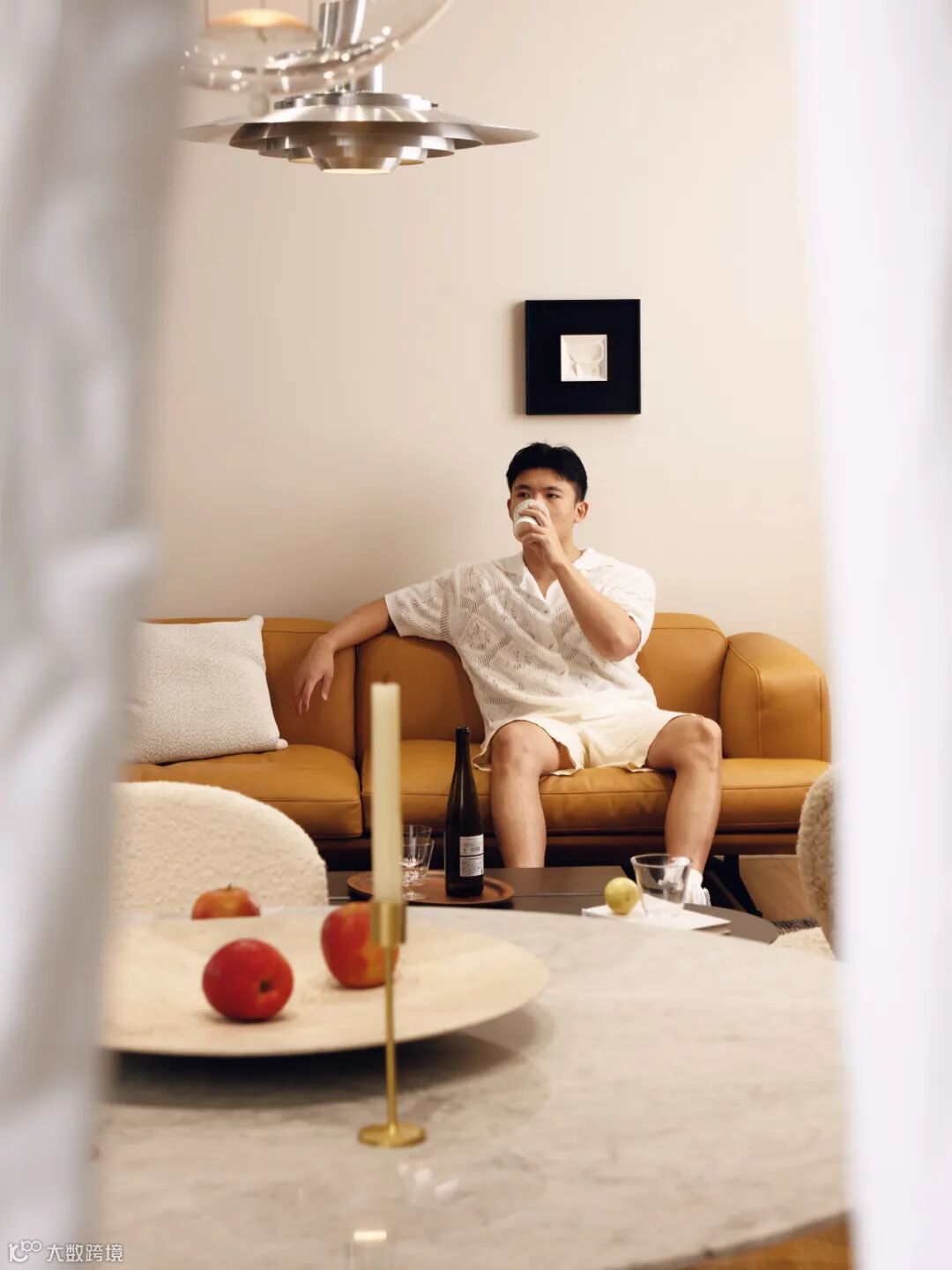 落座于 &Tradition 的 Inland 沙发,皮革的细腻触感与 Ita 实木茶几的温润纹理悄然呼应;