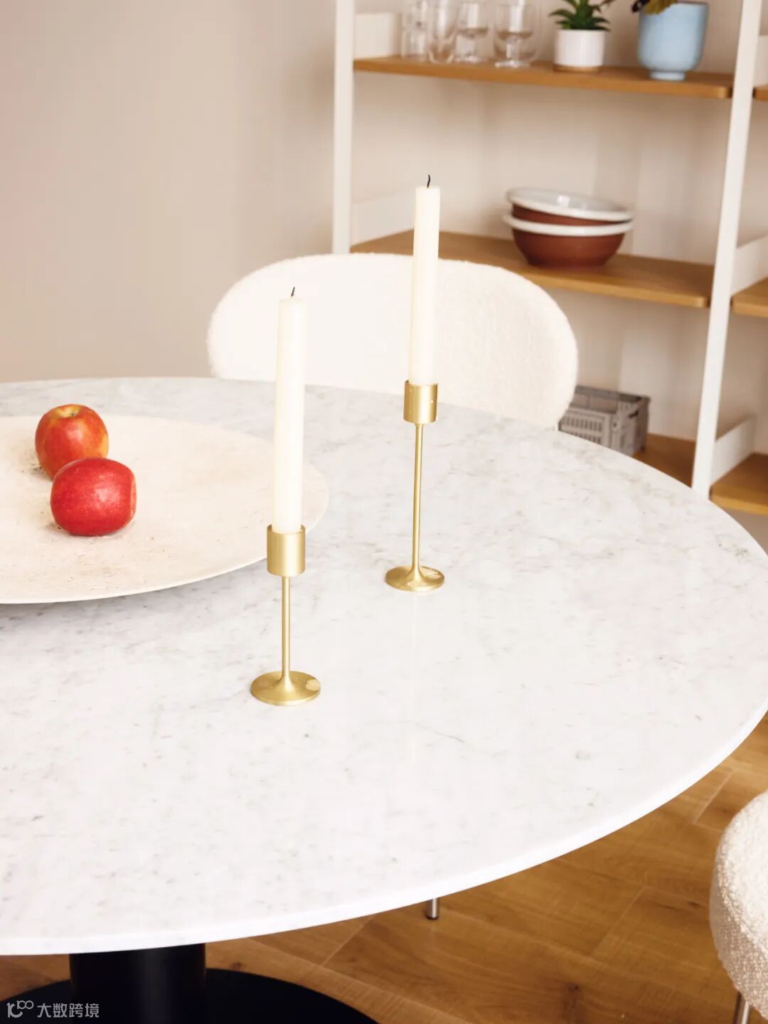 目光转向阅读区,Lato 边桌以天然大理石为基,浅灰底色的白色纹路,宛若凝固的北欧冰川纪事。其圆形桌面由纤细钢柱轻盈托起,构成一则几何的诗意。