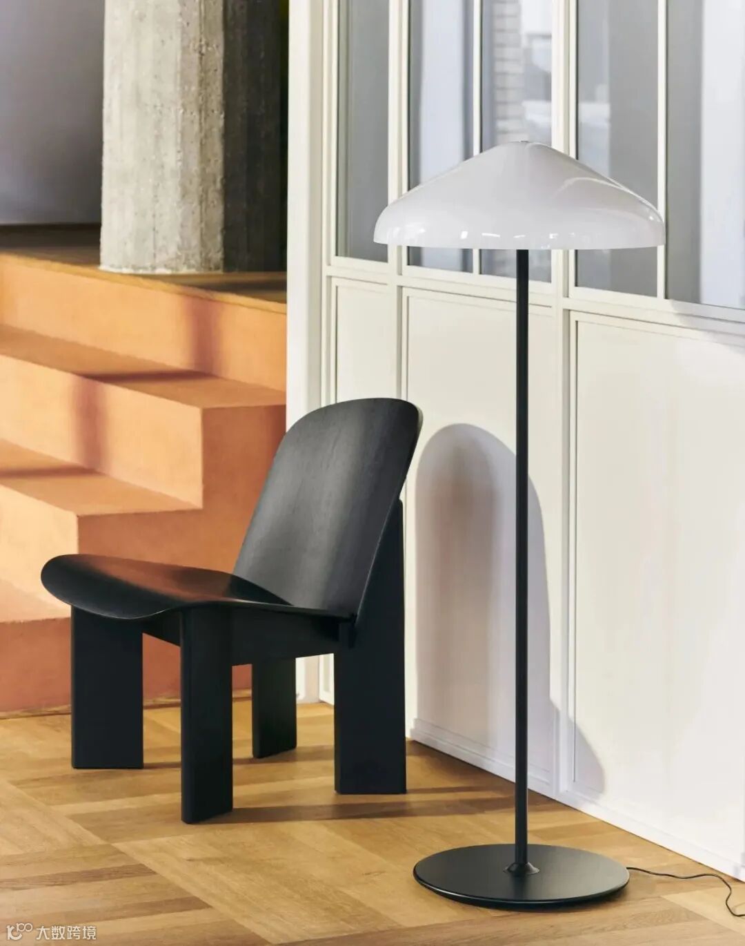 Pao Glass Floor Lamp 落地灯由加重钢制底座和纤细支架组成,灯罩采用白色玻璃制成,且可调节光量,灵活散发舒适的居家气息。