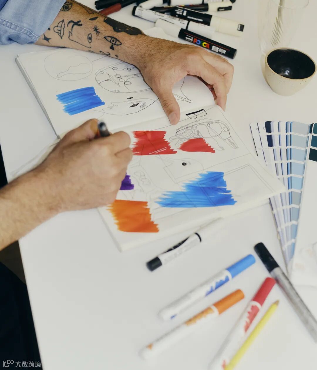 在位于西班牙巴伦西亚市中心的工作室中,Hayon 受到启发用画笔和颜料画出了2015年的原始 Forkamami 模型。在这里,涂鸦作品像日常使用的文具一样,摆放和张贴在各个角落里,甚至出现在他的手臂上。