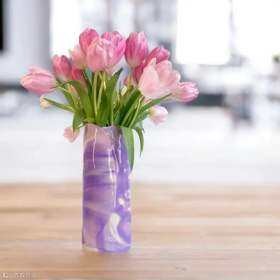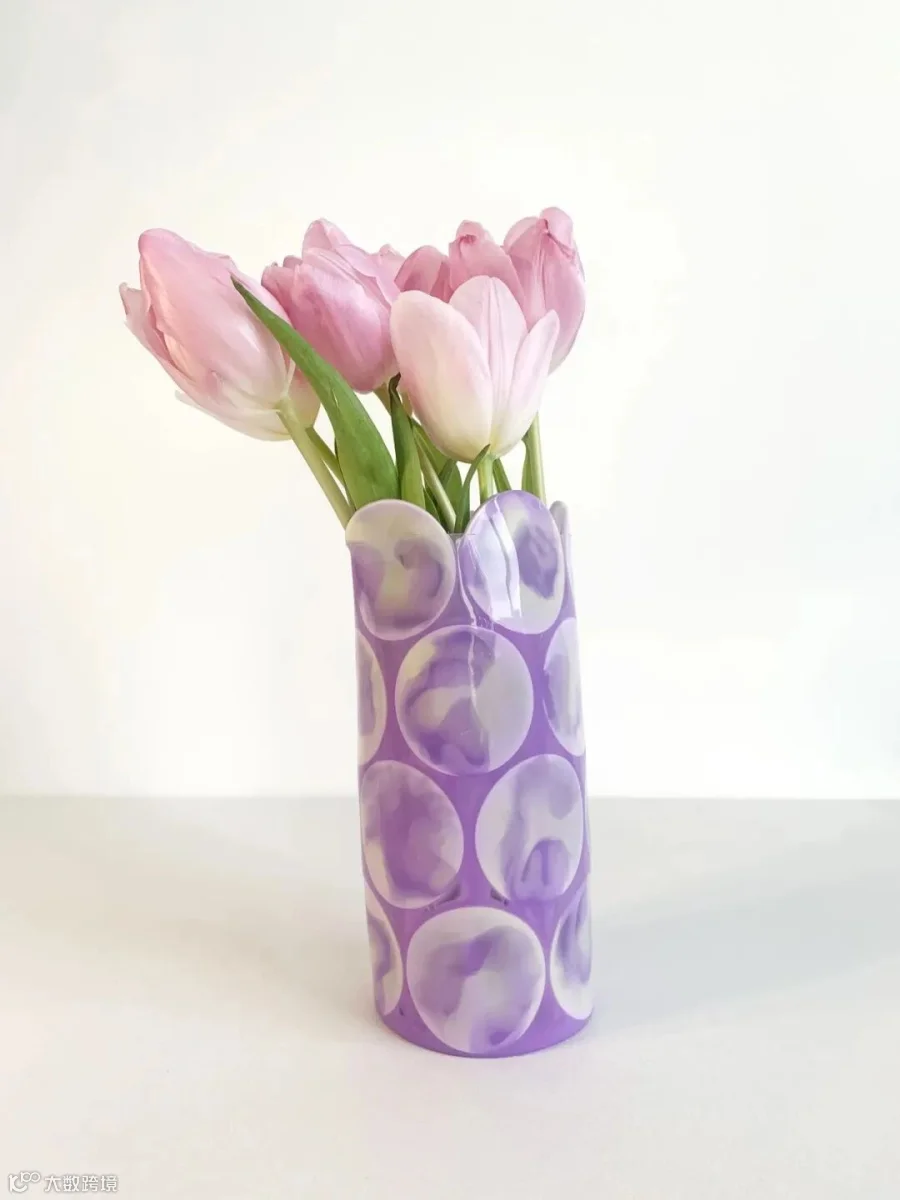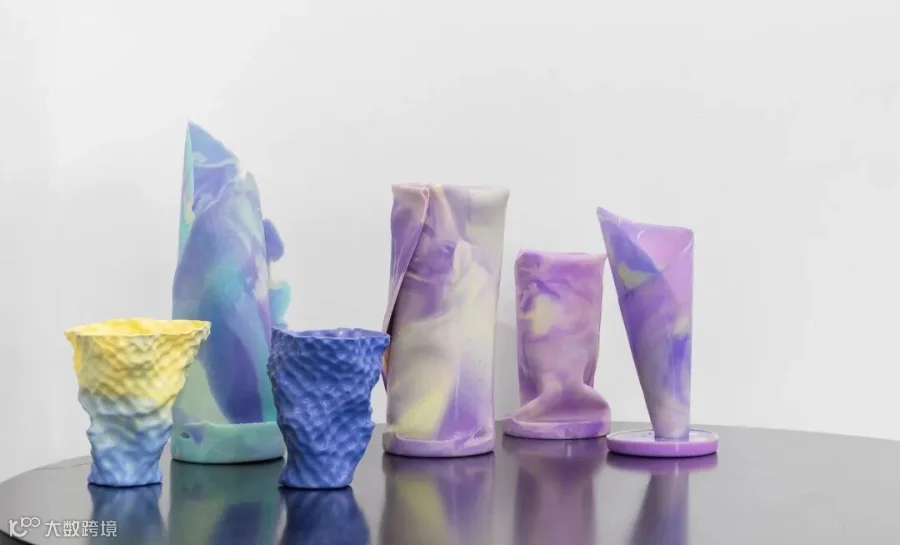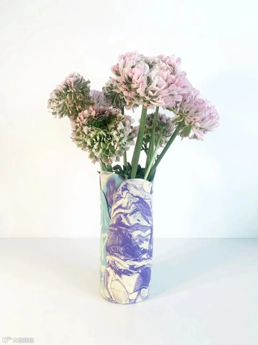 原始状态为液体的硅胶材质在想象的驱动下被塑造成光怪陆离的器物,Natalie 宋鑫子的作品试图挑战既定观念中器物是硬质实体的固有印象,以反传统的造物语言创造出一系列柔软有弹性的炫美花器。每件器物以手工方式制作,抽象的图案和渐变色彩保留下液体硅胶固化瞬间的自然状态。