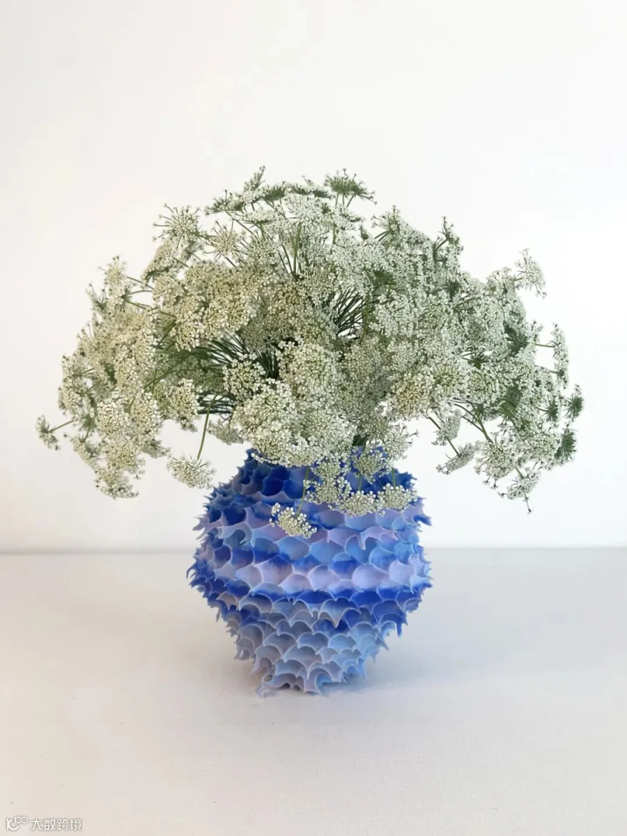 作品有强烈的个人风格,对材料的微妙感受来源于长期以手作方式与材料相处,在过程中洞察和探索这种材质表达之可能性。对于成器方式的摸索,通过大量实验,熟稔平衡了用色、器型与作为花器功能之间的制衡与协调关系。花器作品归为五个系列,探索五种不同的成器逻辑,各具特点妙趣横生。