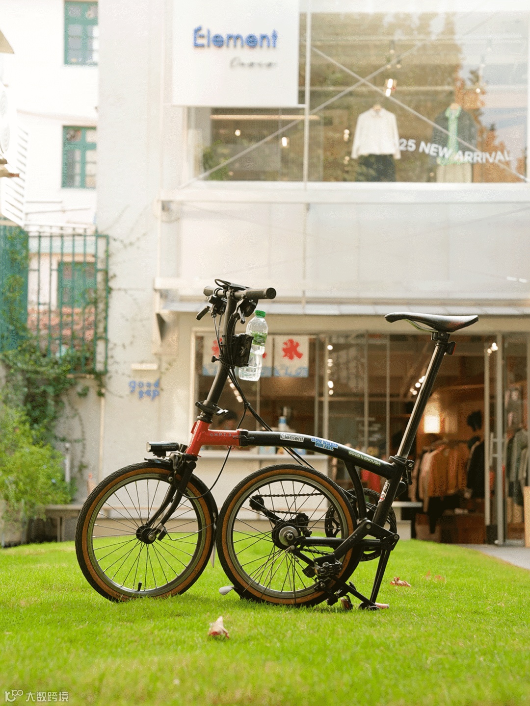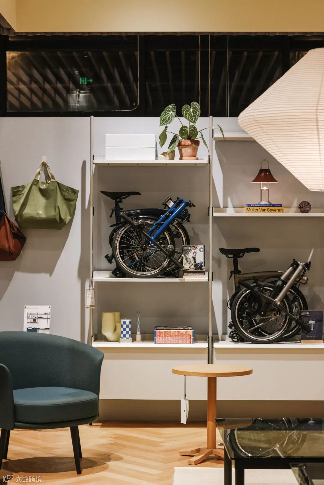 两款 BROMPTON 车型与模块化收纳系统并置,让折叠之后的车成为空间的一部分,象征着一种随时启程又随时归家的生活方式。