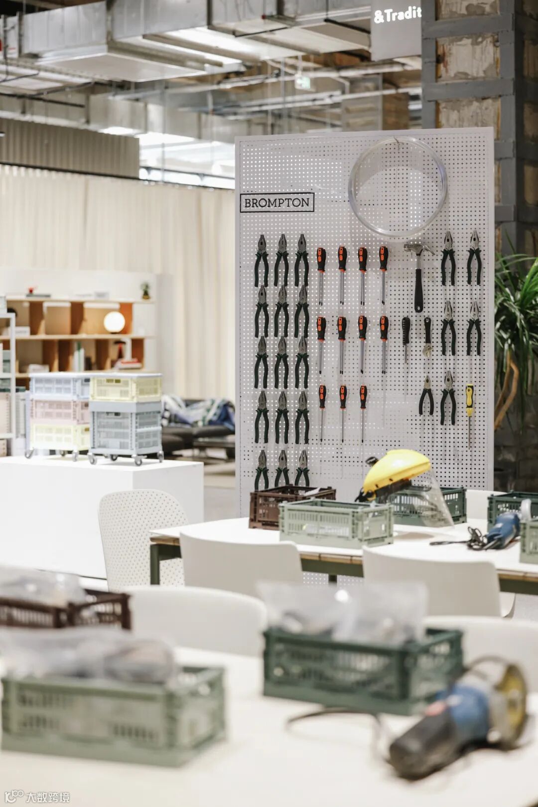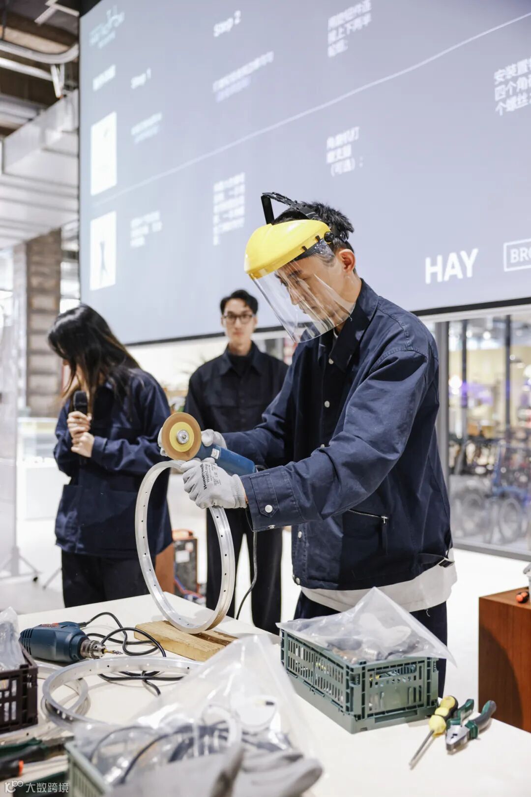 十一月,HAY 与 BROMPTON 共同打造了一场灵活的手工实践。装置艺术家、室内设计师、建筑师胡小钊使用 BROMPTON 的循环零件,进行切割、重组,让它们从车体的一部分,变成能够融入家庭的置物架、台灯等生活器物。金属与光影在工具声中被重新定义,也让“折叠与展开”不止停留在交通工具的层面,而成为一种理解生活的方法。
