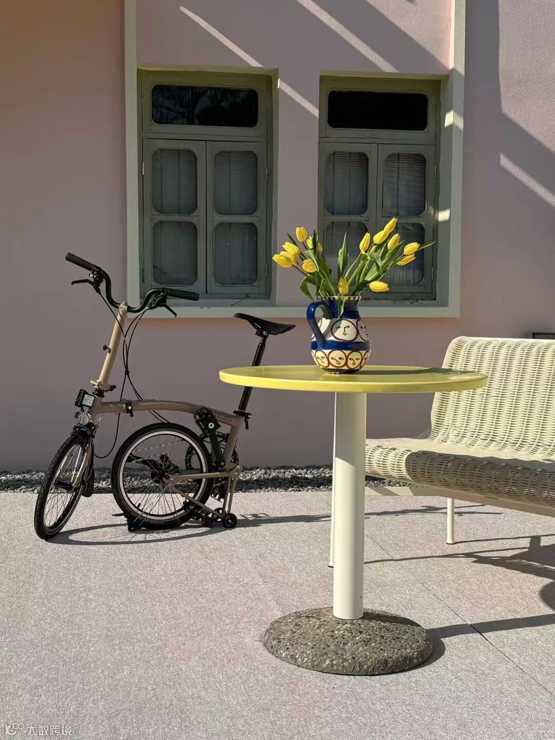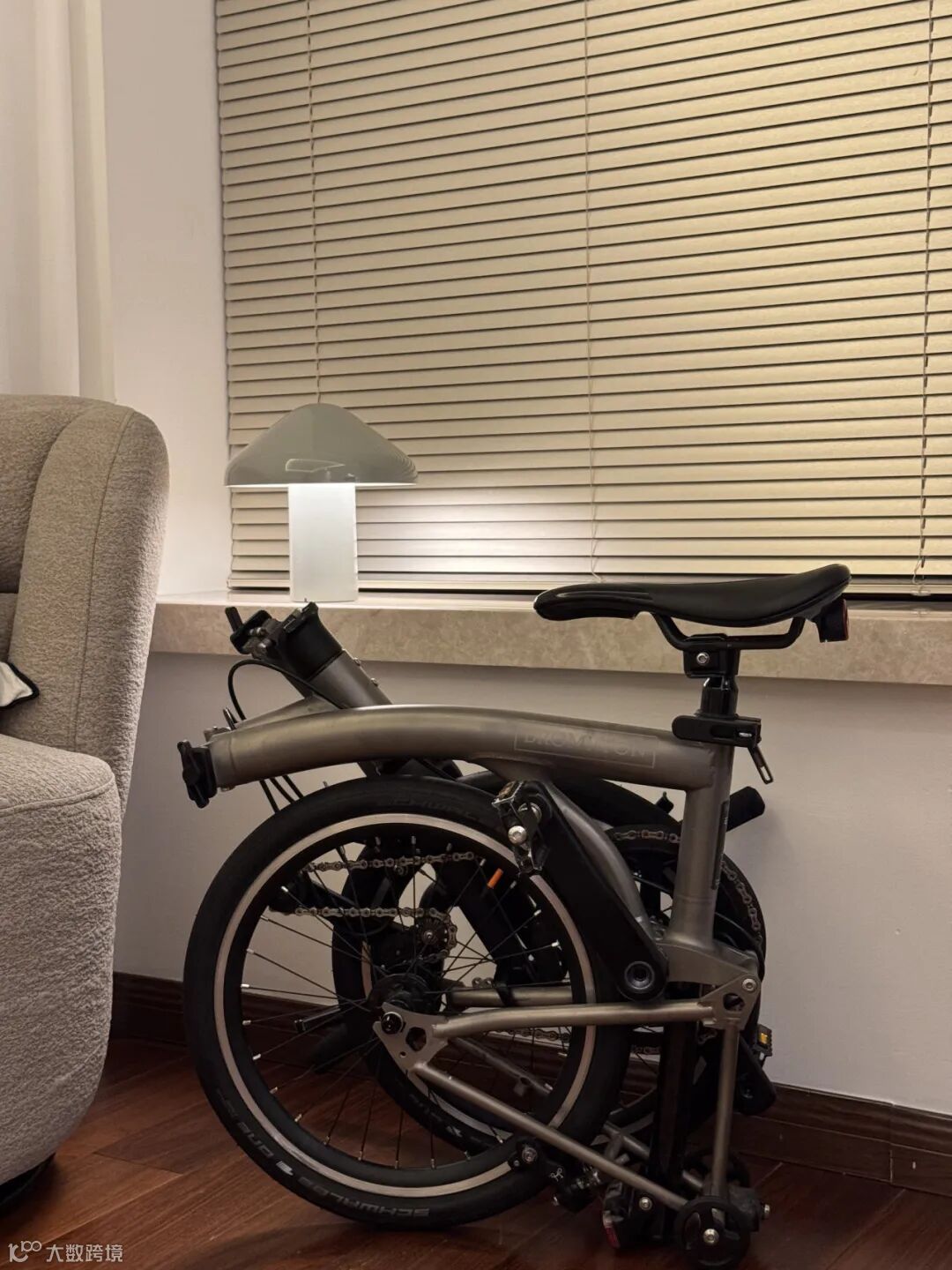 书桌后停放着一辆 BROMPTON 折叠自行车,折叠收起的瞬间,骑行的节奏与家的秩序无缝衔接,成为生活日常的一部分。