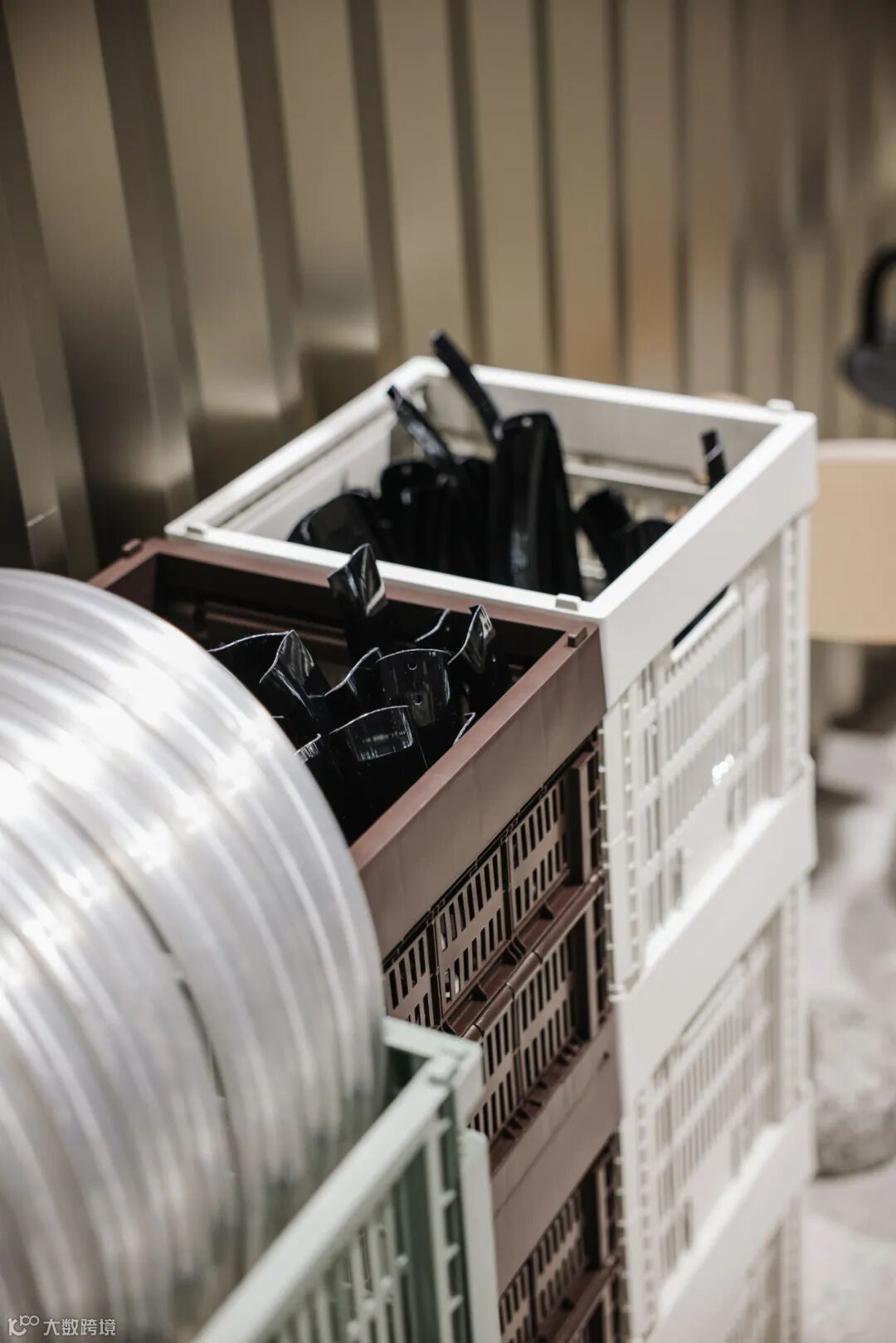 一旁的 Perforated Cabinet 以半透的金属柜体隐藏日常杂物,保持空间的整洁与呼吸感;轻盈的孔洞设计,也让“收纳”不再只是隐藏,而是一种柔和的展示。