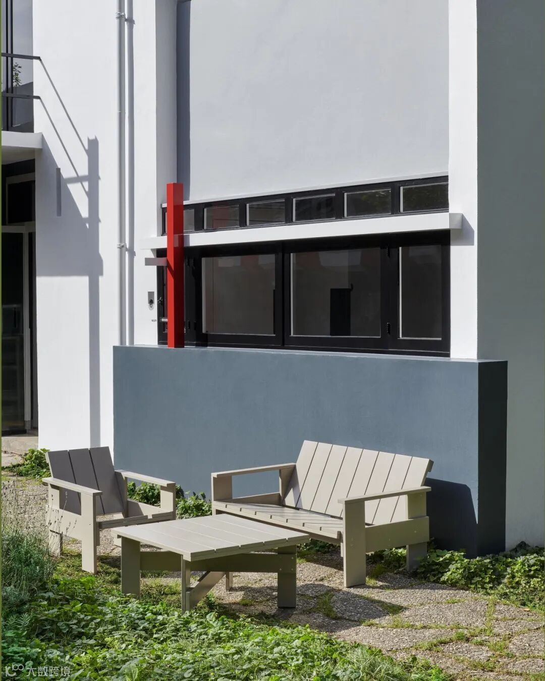 宽幅的木板条厚薄适中,横平竖直亦或是倾斜着组成椅桌,简约直白且自带空间感的设计呈现出设计师鲜明的建筑风格——提供功能与舒适特性的同时,保留空间自身的呼吸感。