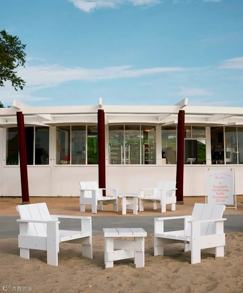 如今,咖啡馆和餐厅Wulff & Konstali占据了其中一个历史悠久的海滩位置,来自同一时代的,由荷兰建筑师 Gerrit Rietveld 设计的 Crate 户外家具系列与 Arne Jacobsen 的极简主义外观相得益彰。