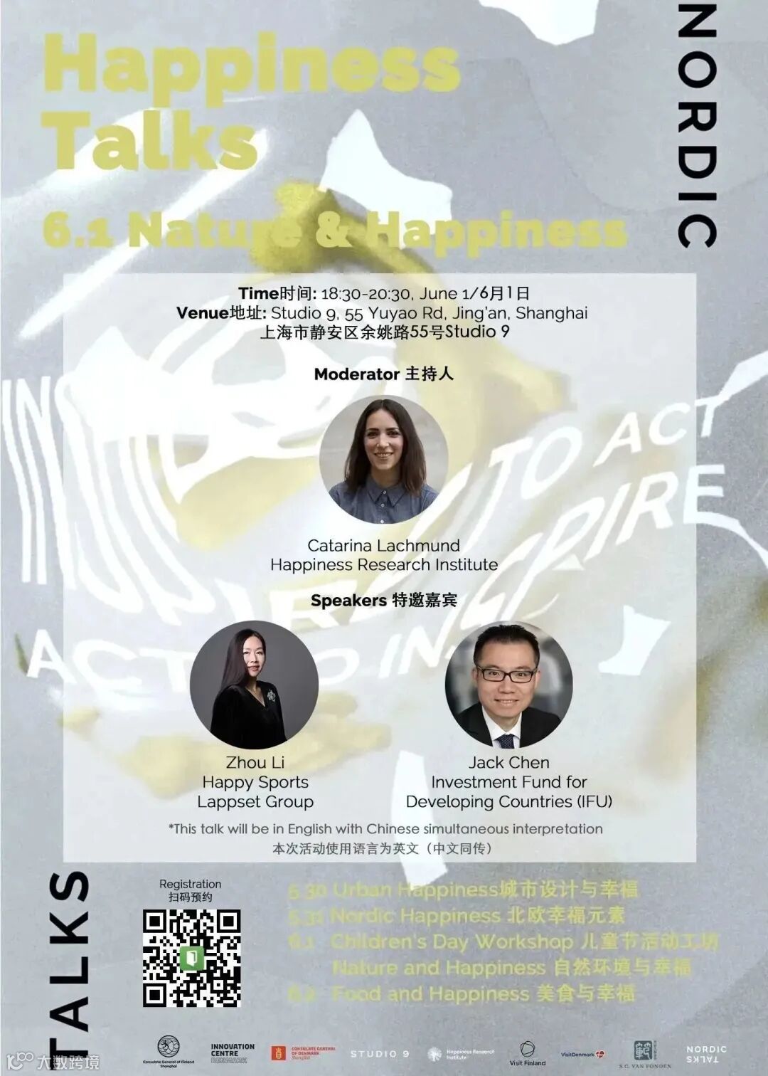 关于北欧的幸福,你想了解什么?关于幸福,你又有什么想分享的?我们精心策划了四场对话,并邀请了不同领域的多位专家来分享他们关于“幸福”的见解。本次系列对话的话题涵盖:城市建设与幸福、北欧幸福感、自然环境与幸福、美食与幸福。
