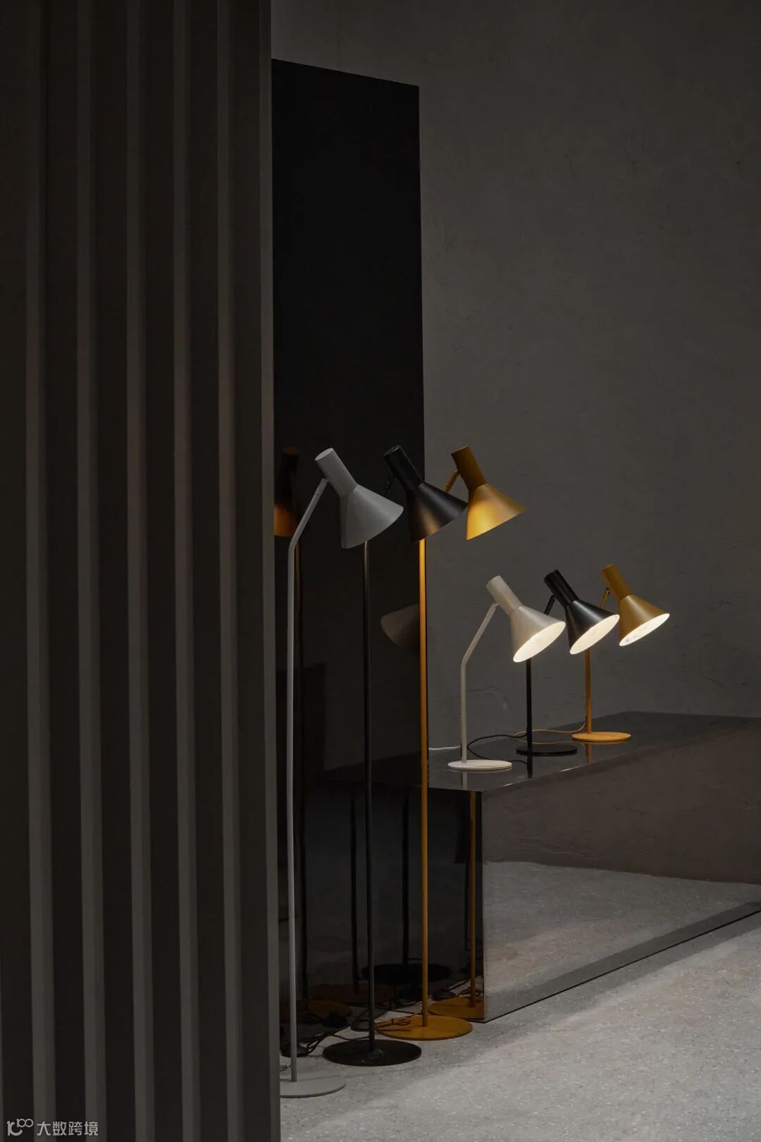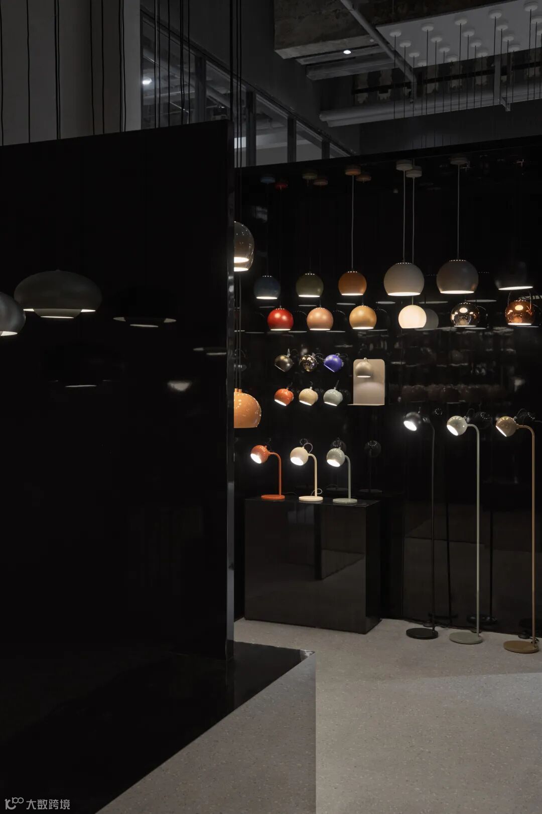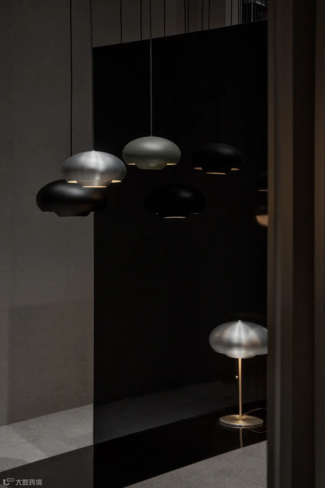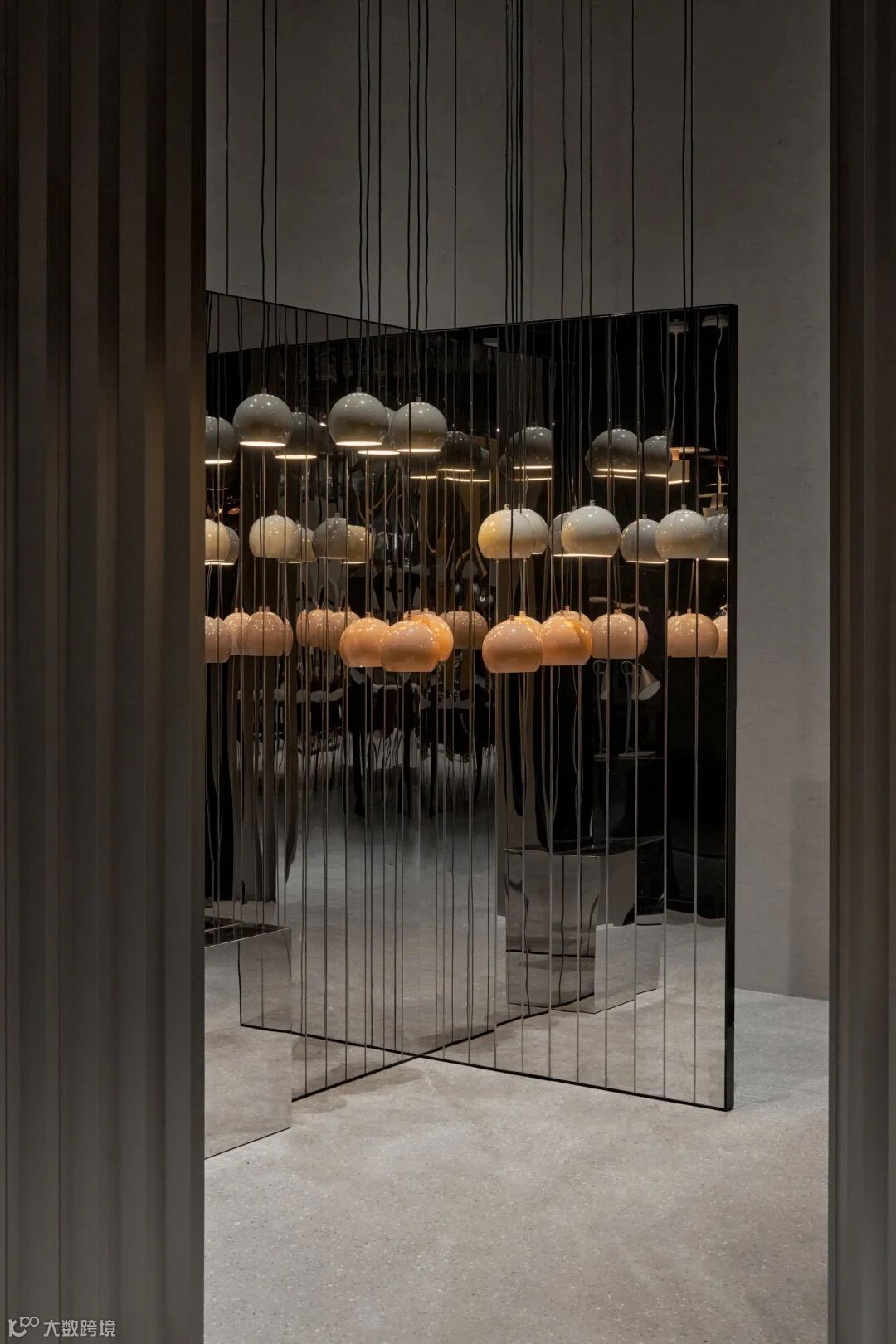 静谧的黑灰色统一了空间背景,镜面装饰倒映出 Ball 的身影,层层叠叠的幻影中给予观众强烈的视觉体验,在突出其外观特点的同时,让灯具的功能性以最自然的方式进行呈现。