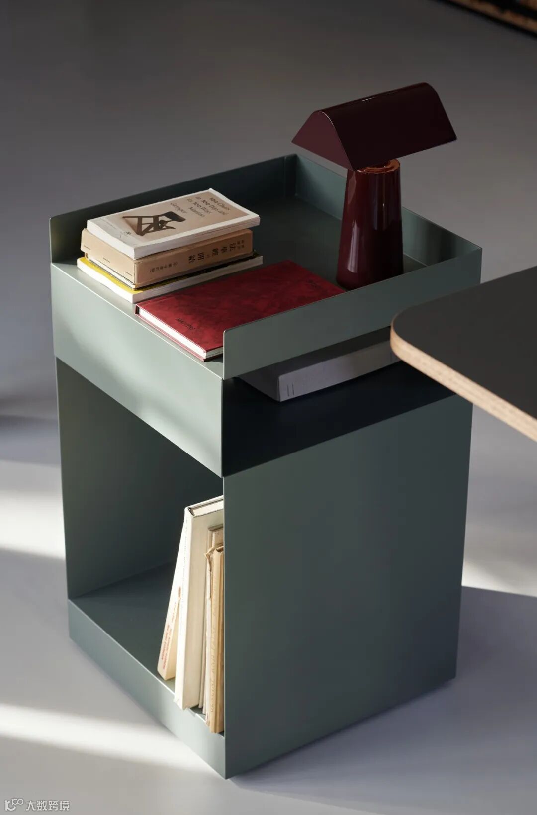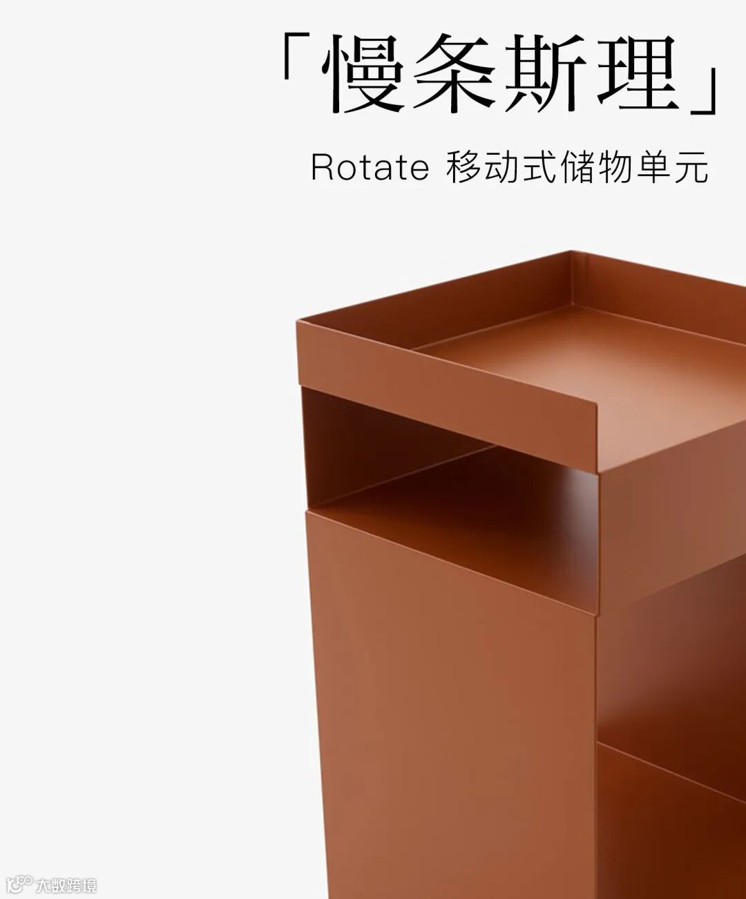 Rotate 普适性的高度使得它可以作为床头柜、边桌等置物家具来使用,也可以放置在办公空间中,当作文件储物柜。同时,三层存储空间的高度不同,亦可放置不同类型的生活、工作用品。