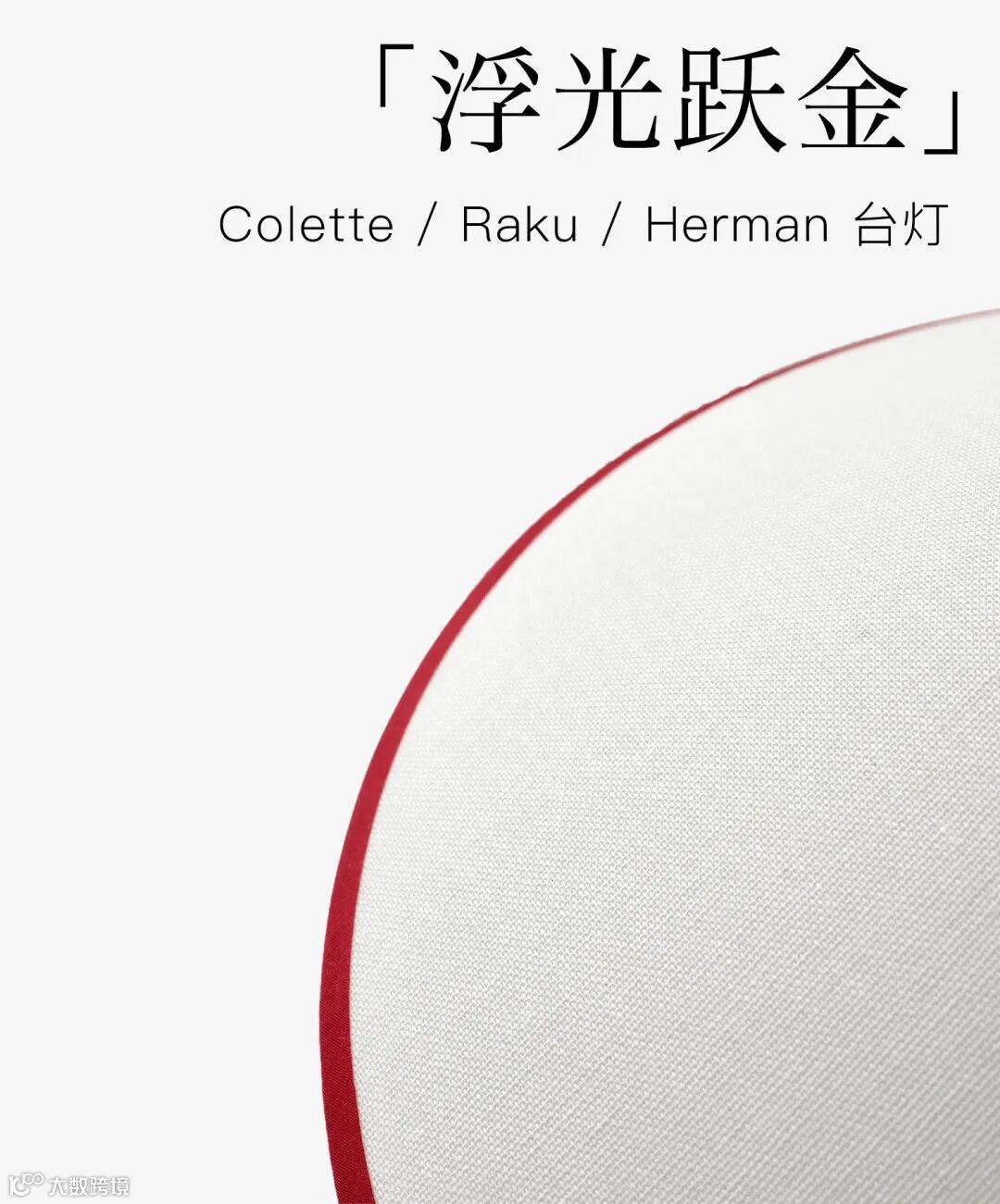 棉麻混合布艺材料紧紧包裹住灯座部分,同样材质的灯罩与其形成整体,上下的黑/红色包边为 Colette 增加装饰艺术风格,再现上世纪法国设计的优雅,使其辨识度得到加强。